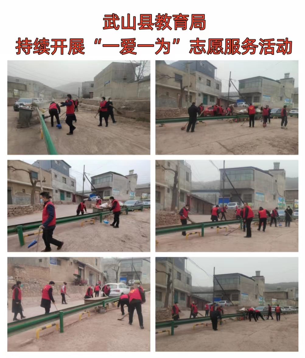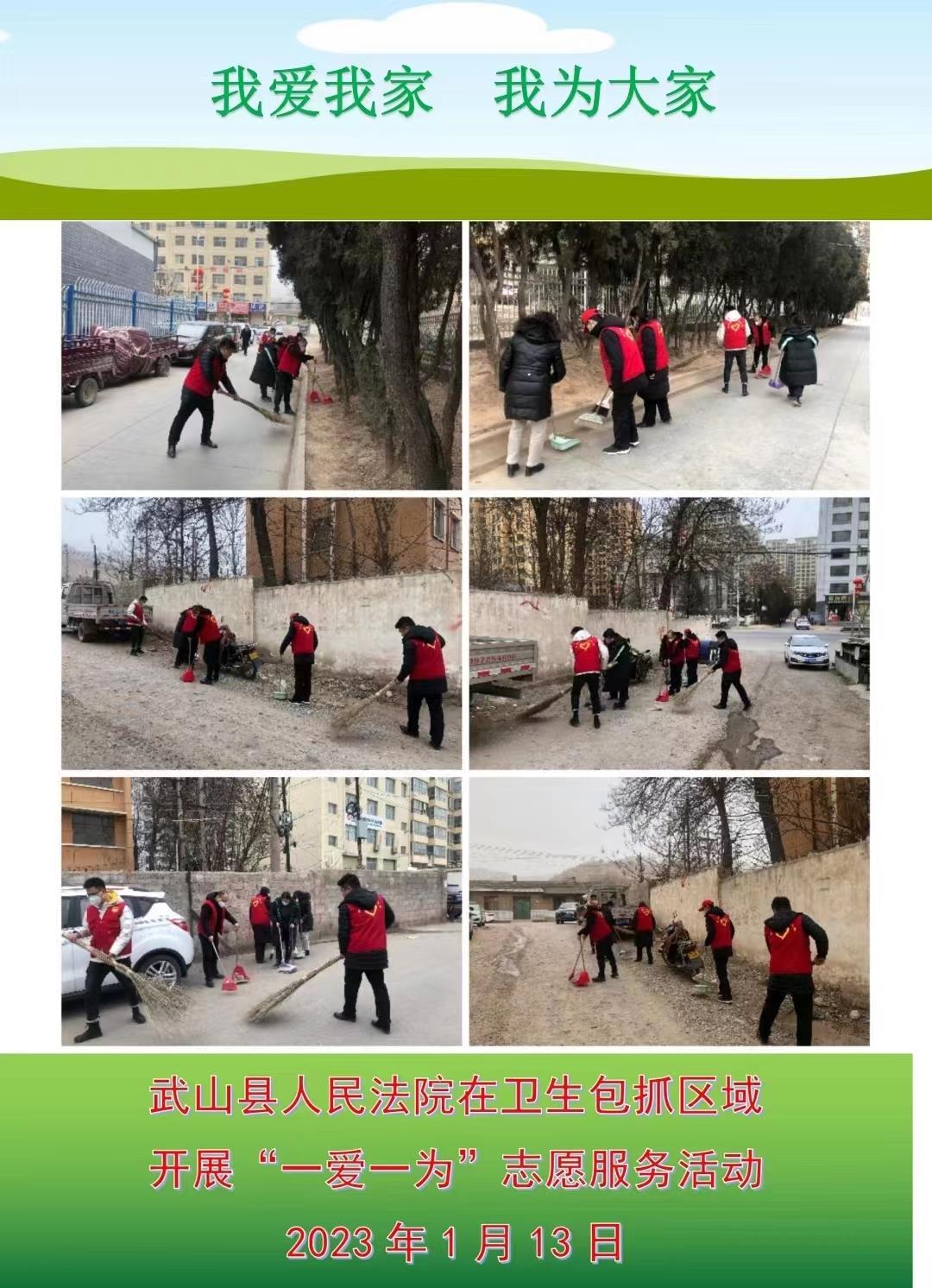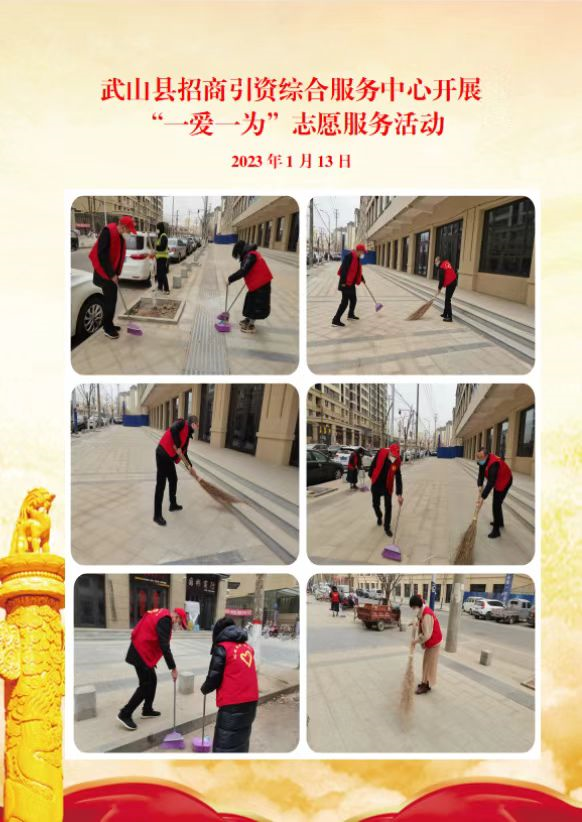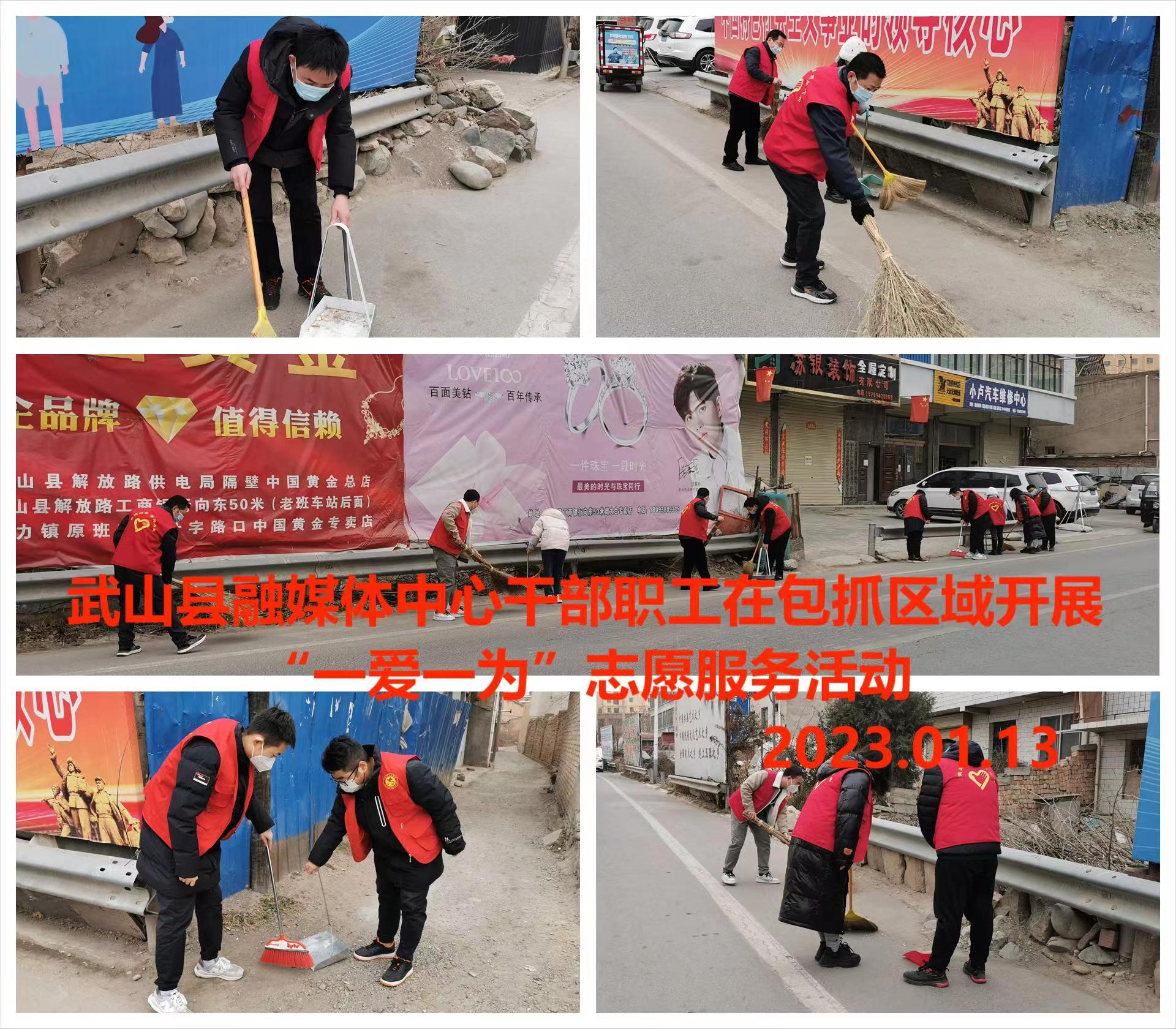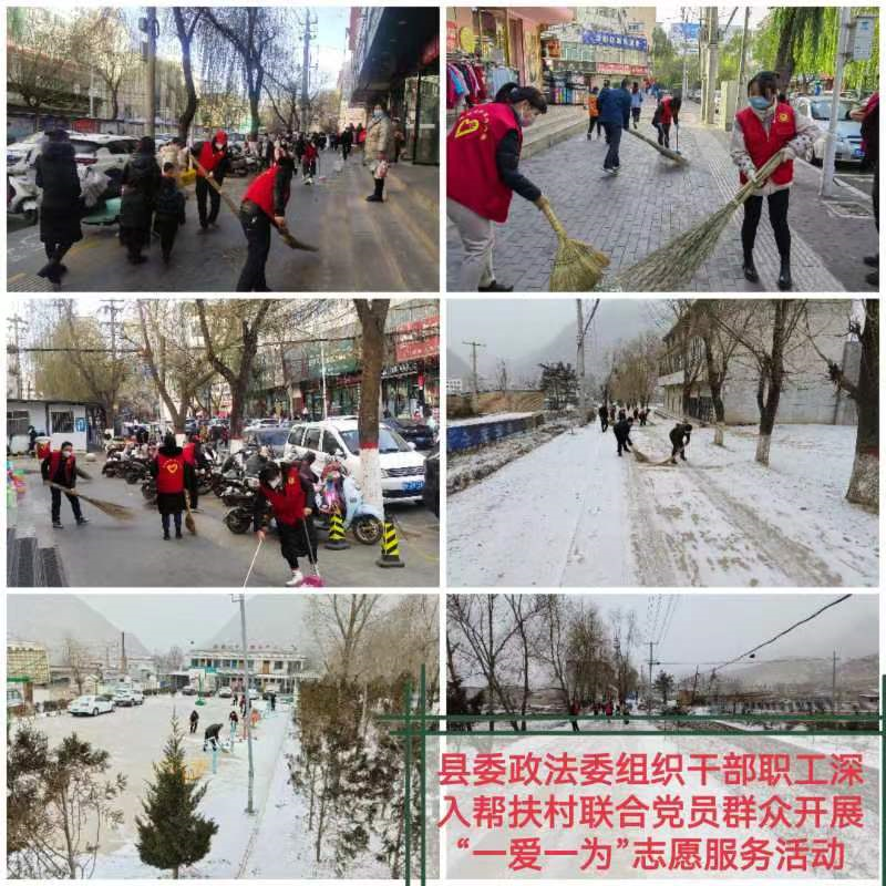 武山县融媒体中心1月13日讯(记者 唐文斌)新春临近,年味渐浓。为倡导文明健康的生活习惯,营造健康祥和、积极向上的文化氛围和节日气氛,1月13日,武山县各乡镇各部门各单位深入各自包抓街道、巷道、小区,组织干部群众志愿者认真开展以卫生清洁、杂物清除及积雪清扫等为内容的“一爱一为”志愿服务行动,不断提高广大群众的幸福感、获得感、安全感。