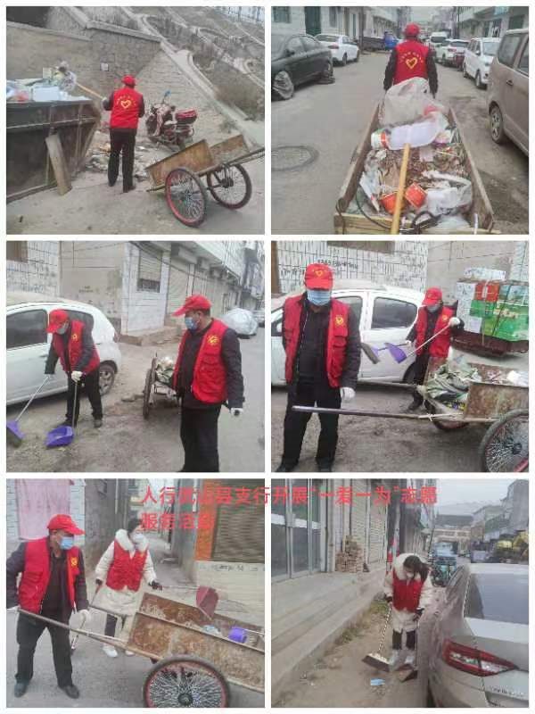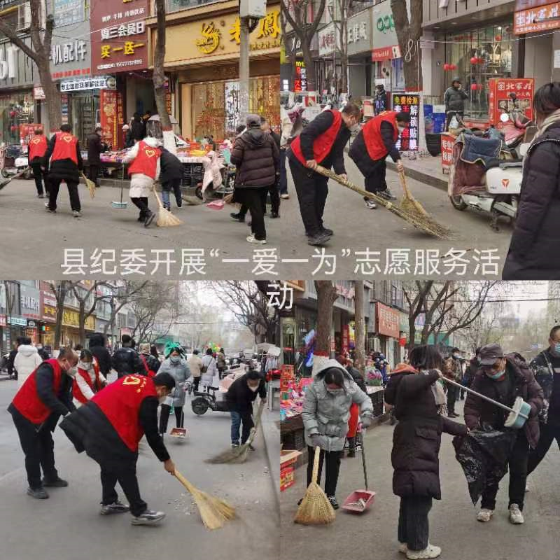 在县城,一个个身穿红色马甲的志愿者弘扬“奉献、友爱、互助、进步”的志愿服务精神,不怕累、不怕脏,不怕寒冷,深入城区公路、街道、沟渠边角等环境卫生死角区域,认真清理路面泥土、塑料、街道墙面垃圾广告,使城区环境面貌焕然一新。