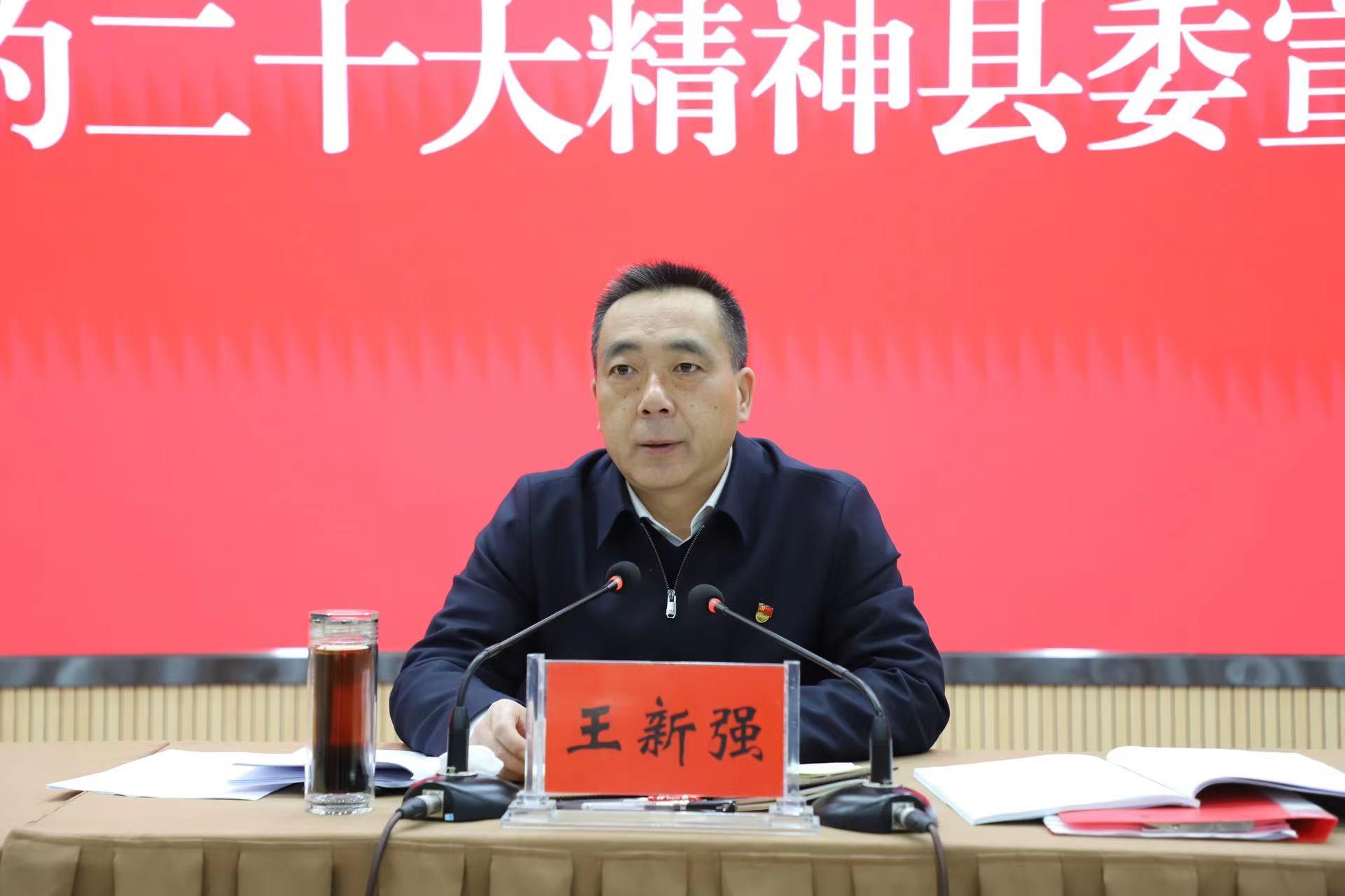 王新强强调,学习好、宣传好、贯彻好党的二十大精神,是当前和今后一个时期的重要政治任务,要对标对表党的二十大作出的新部署新要求,切实把党的二十大确定的目标任务细化实化为具体工作举措,确保各项工作任务落地生根。要抓学习促提升,在践行“两个维护”上见成效,深刻领悟“两个确立”的决定性意义,增强“四个意识”、坚定“四个自信”、做到“两个维护”,始终在政治立场、政治原则、政治方向、政治道路上同以习近平同志为核心的党中央保持高度一致。要抓产业促融合,在县域经济发展上见成效,全力打造蔬菜和生猪两个“五十亿级”全产业链,扎实开展“强工业”行动,加快推进水帘洞国家5A级旅游景区和国家全域旅游示范区创建,全力推进县域经济高质量发展。要抓扶持促均衡,在城乡全面振兴上见成效,扎实开展“一线六圈”城乡振兴计划,推进城乡全面发展。要抓民生促保障,在增强人民福祉上见成效,统筹做好就业、教育、医疗等各项工作,用心用情用力解决好人民群众急难愁盼问题。要抓思想促共识,在渭川文化引领上见成效,深入开展渭川文化挖掘整理行动,擦亮“渭川文化”品牌,凝聚思想共识。要抓党建促引领,在从严管党治党上见成效,扎实推进基层组织建设,用好“三广三公三树立”“五化五注重”选人用人机制,不断加大正风肃纪反腐力度,持续营造风清气正的干事创业环境。