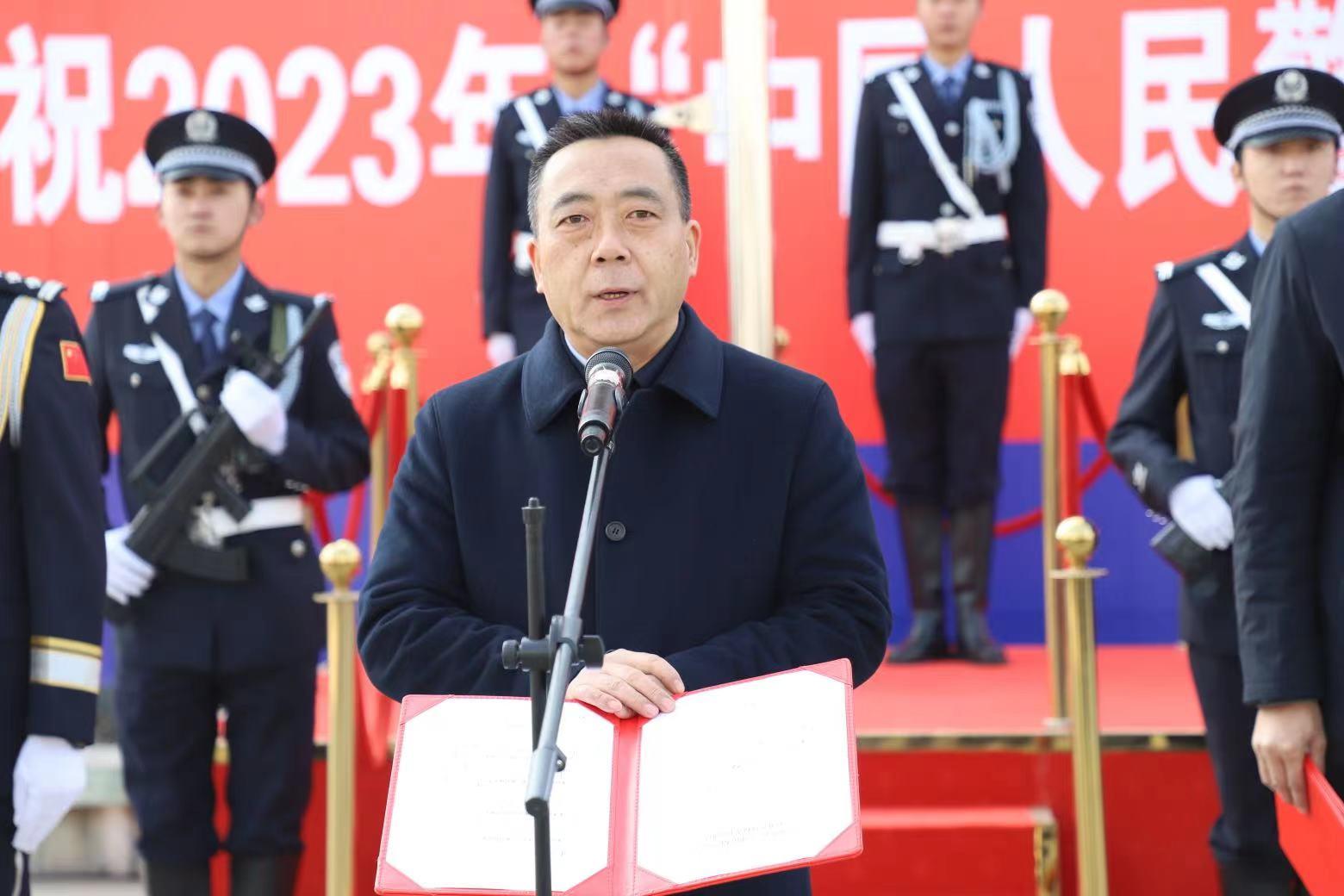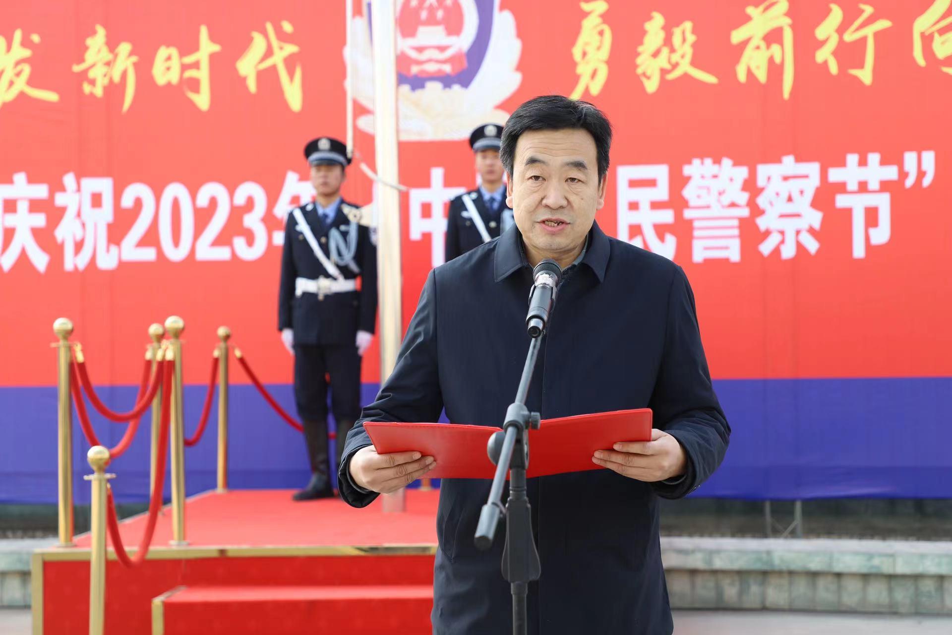 县委书记王新强出席仪式并讲话,县委常委、政法委书记令军强主持仪式,副县长、县公安局局长温阿军致辞并带领全体公安干警重温入警誓词。县人民法院院长李琳、县人民检察院检察长赵少华及县直相关部门负责人、县公安局班子成员和全体干警,退休民警和法检两院警察代表参加仪式。