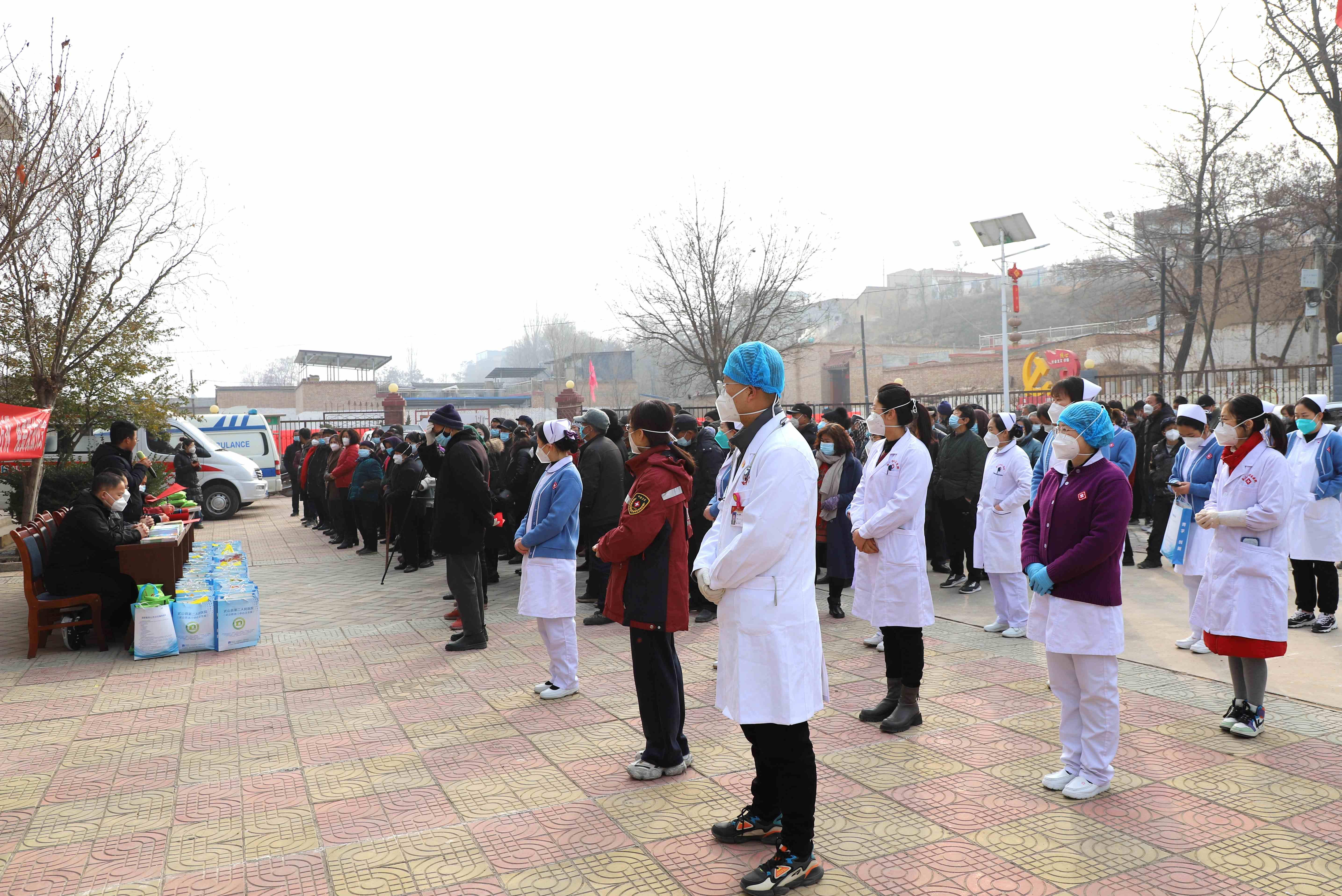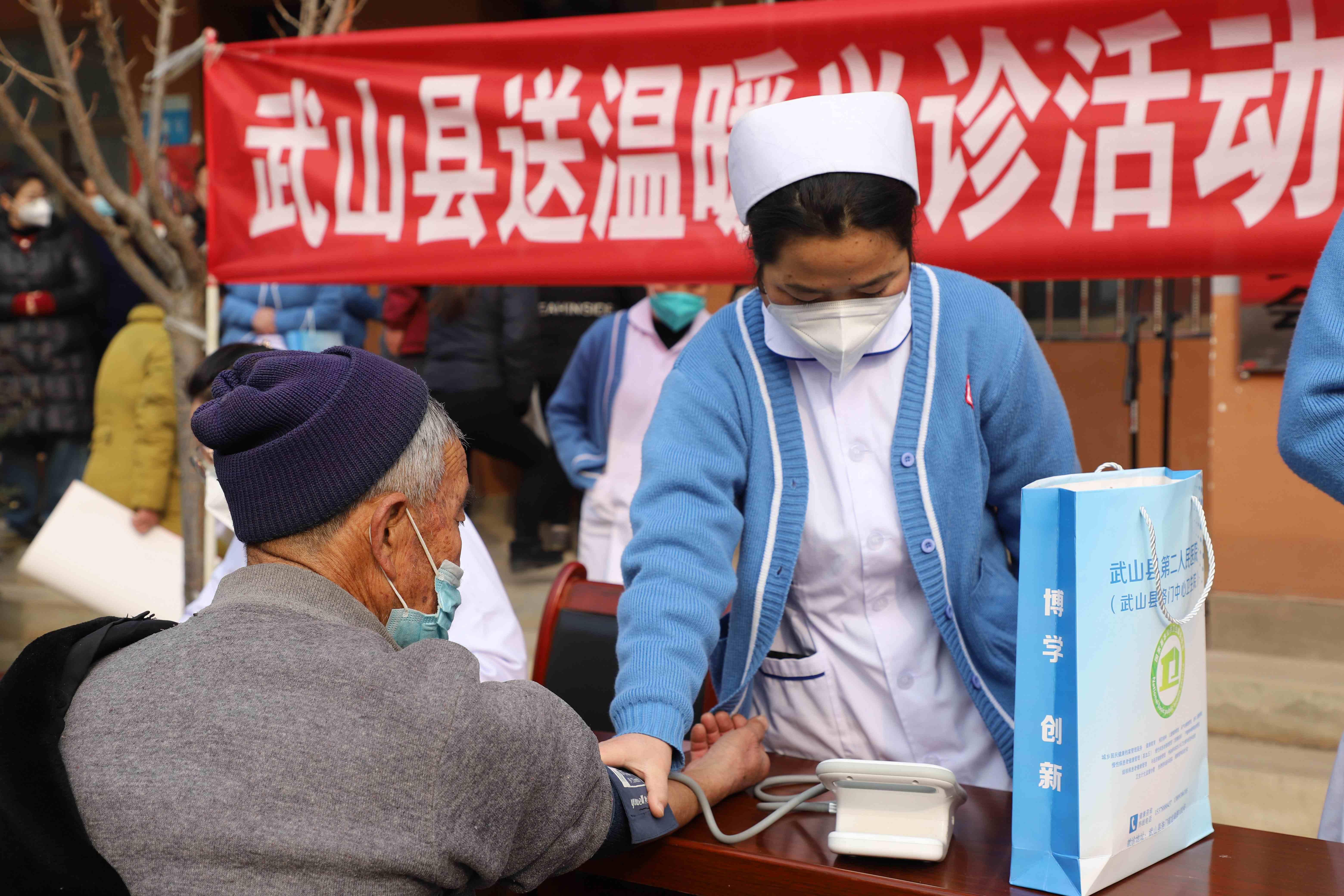 武山县融媒体中心1月5日讯(记者 关正庚 杨文丽 丁秀秀)为深入贯彻落实党的二十大精神和《甘肃省关于为农村老年高风险人群提供“甘肃方剂”工作方案》,切实做好重点人群“保健康、防重症”工作,1月5日,武山县卫健局联合洛门镇镇党委、县卫生监督所、县中医医院、洛门中心卫生院、县医药公司等县域内各大医疗机构,深入洛门镇旱坪村开展送温暖义诊活动暨重点人群“甘肃方剂”免费发放仪式。