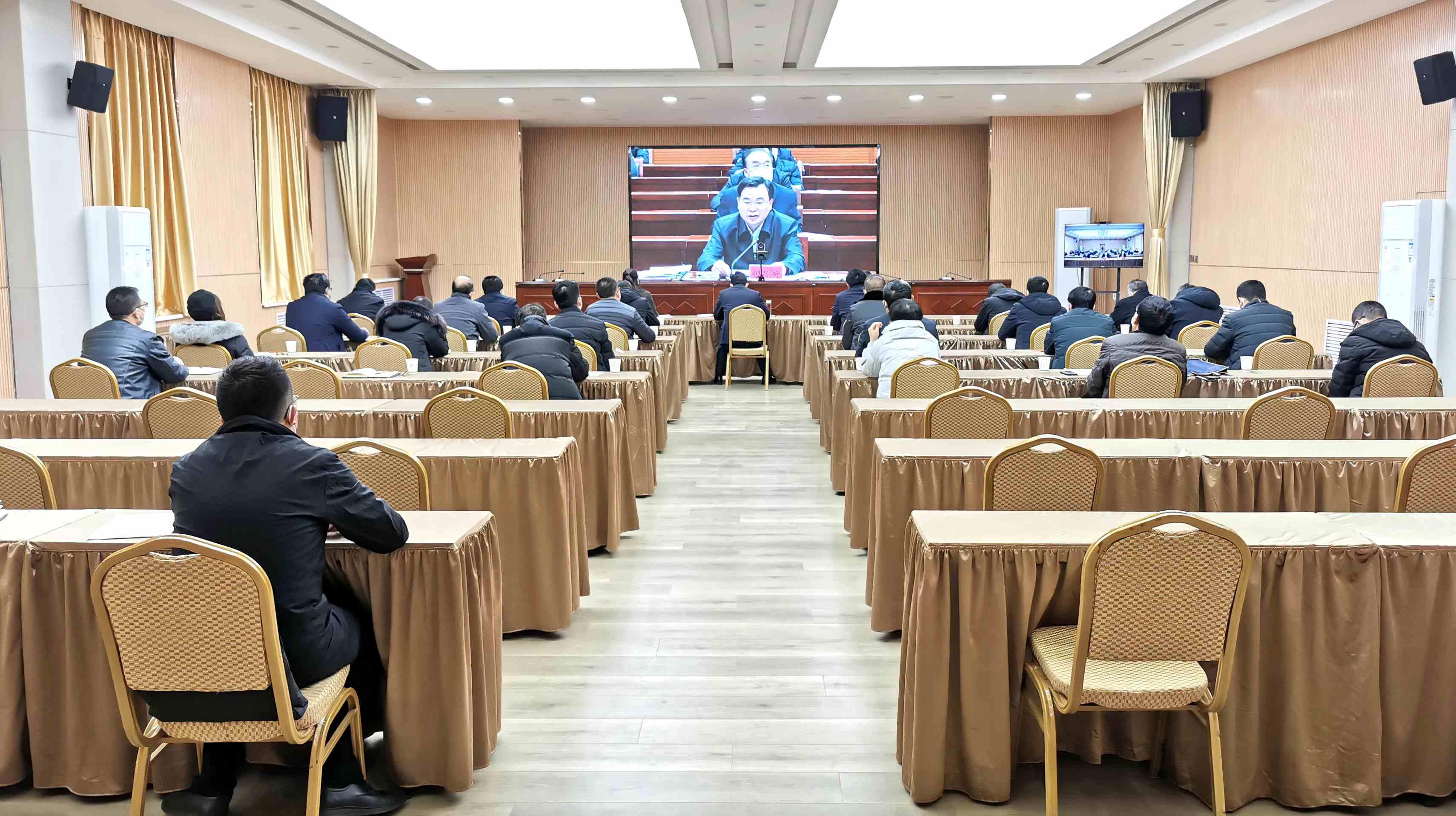 会议以视频形式开至县一级。县领导王志成、胡丽霞、李峰及相关部门负责人在武山分会场参加会议。