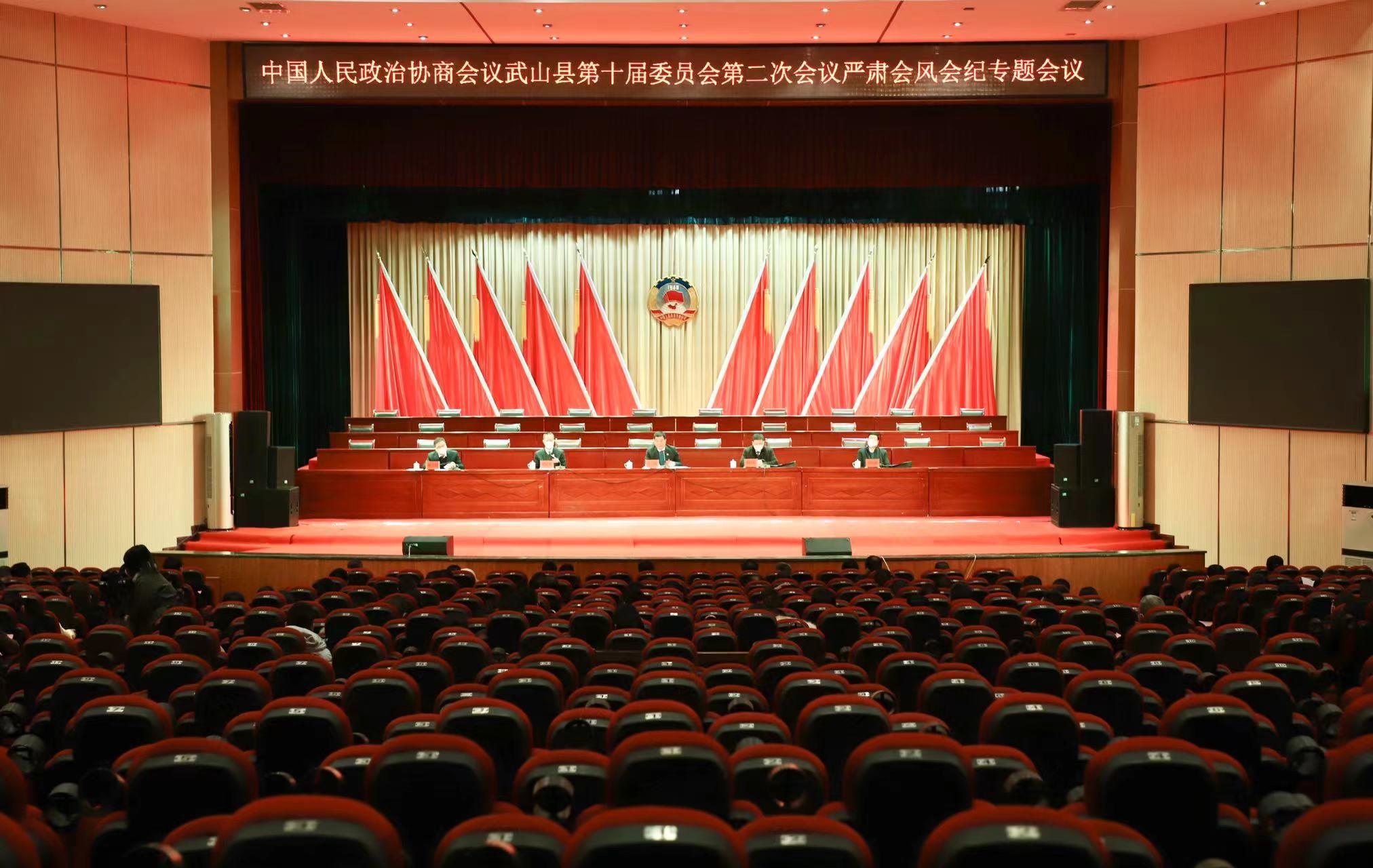 武山县融媒体中心12月26日讯(记者 杨耀斌 彭雪)12月26日,政协武山县第十届委员会第二次会议严肃会风会纪专题会议在县群众文化活动中心礼堂召开。县政协副主席孟立瑞主持会议。县政协副主席邓红兵、吴健明,秘书长魏小银,党组成员宗新武及全体县政协委员参加会议。