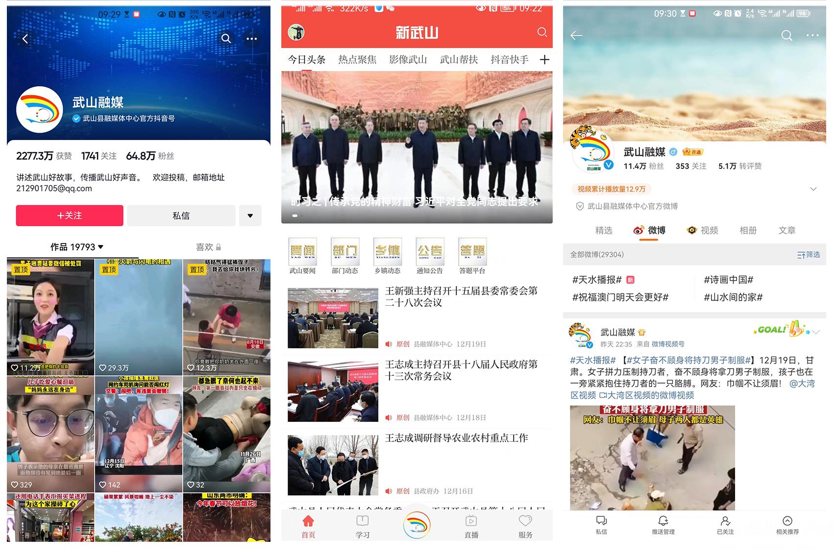 二是守正创新引领,全媒体协同发力。发挥新兴媒体平台优势,深耕本土新闻,打造优质内容,广播电视、政府网站、新武山、武山发布和武山融媒公众号、武山融媒抖音号、快手号、微博和头条号等平台,入驻新华社、央视频、视听甘肃、新甘肃、新天水等国家和省市级平台不断发力,持续提升“武山融媒”的传播力和影响力,舆论主阵地稳步提升。各平台全年共发布各类信息5.8万余条,其中图文信息4.4万余条,海报420余幅,短视频1.4万余条,全年累计阅读量超5亿次。截至目前,新武山客户端下载量达6.73万余人次,占常住人口数的18.7%;武山融媒抖音号粉丝数64.6万,获赞2254.2万;武山融媒微博粉丝量12万;武山融媒头条号粉丝数10.9万,获赞434.8万,新华号阅读量100万以上作品60余部,全县新闻宣传工作稳步提升。