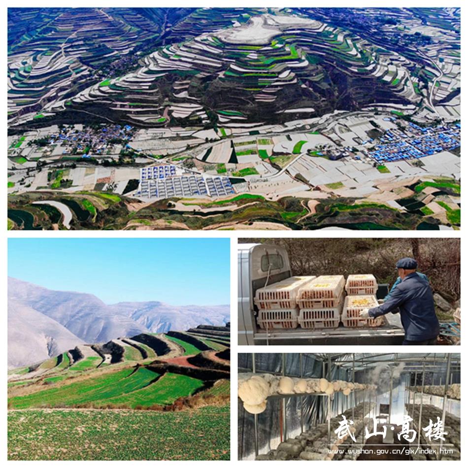(上:玉林沟万亩全膜玉米种植示范区,下左:李坪村连片冬小麦种植区,下右:村集体经济)