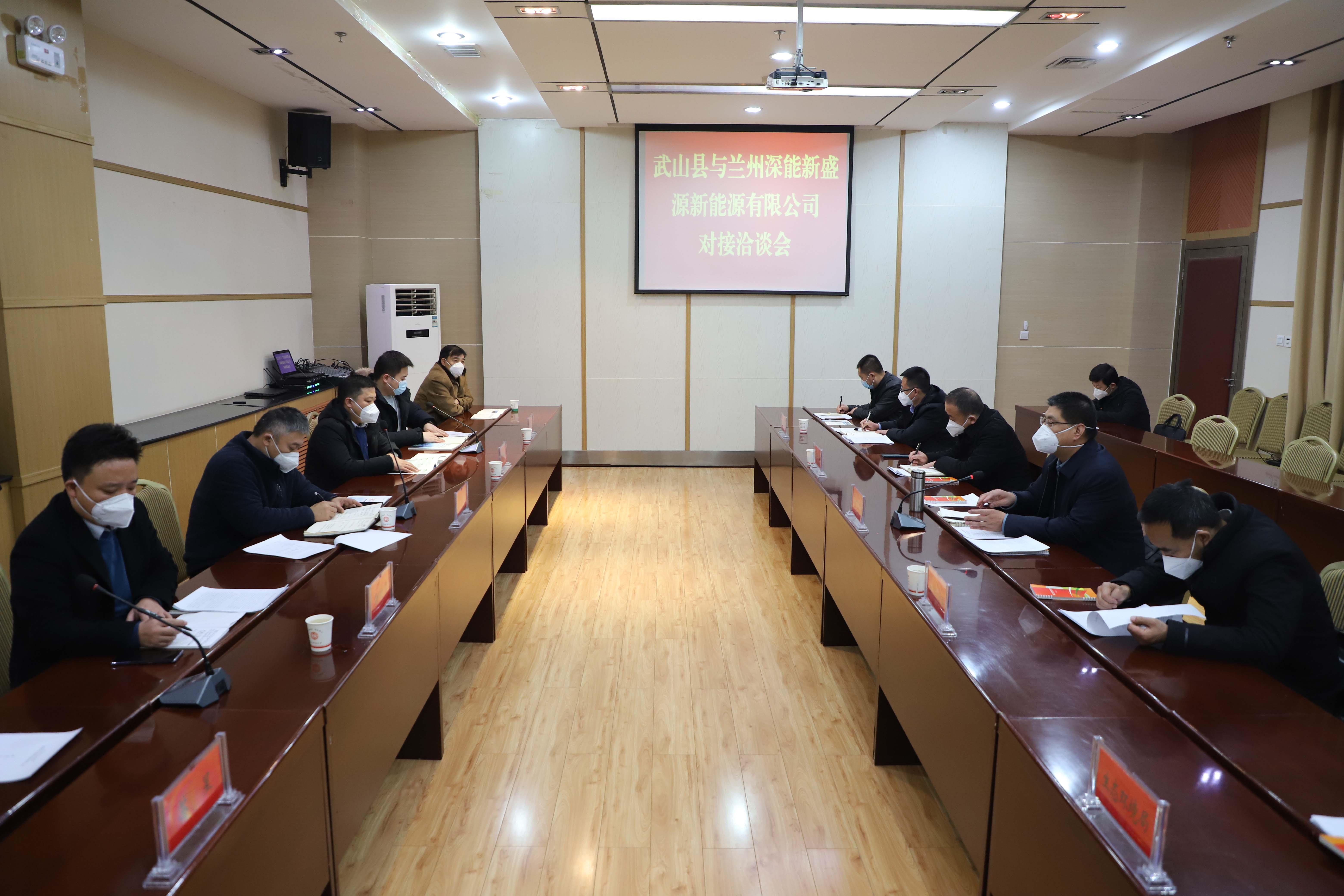 武山县融媒体中心12月22日讯(记者 关正庚 车彤谣)12月22日,兰州深能新盛源新能源有限公司工程部专家陈东九、杨付荣一行来武山县对接洽谈项目建设及投资合作事宜。县委常委、副县长赵百祥出席洽谈会,武山县相关单位部门负责人参加会议。