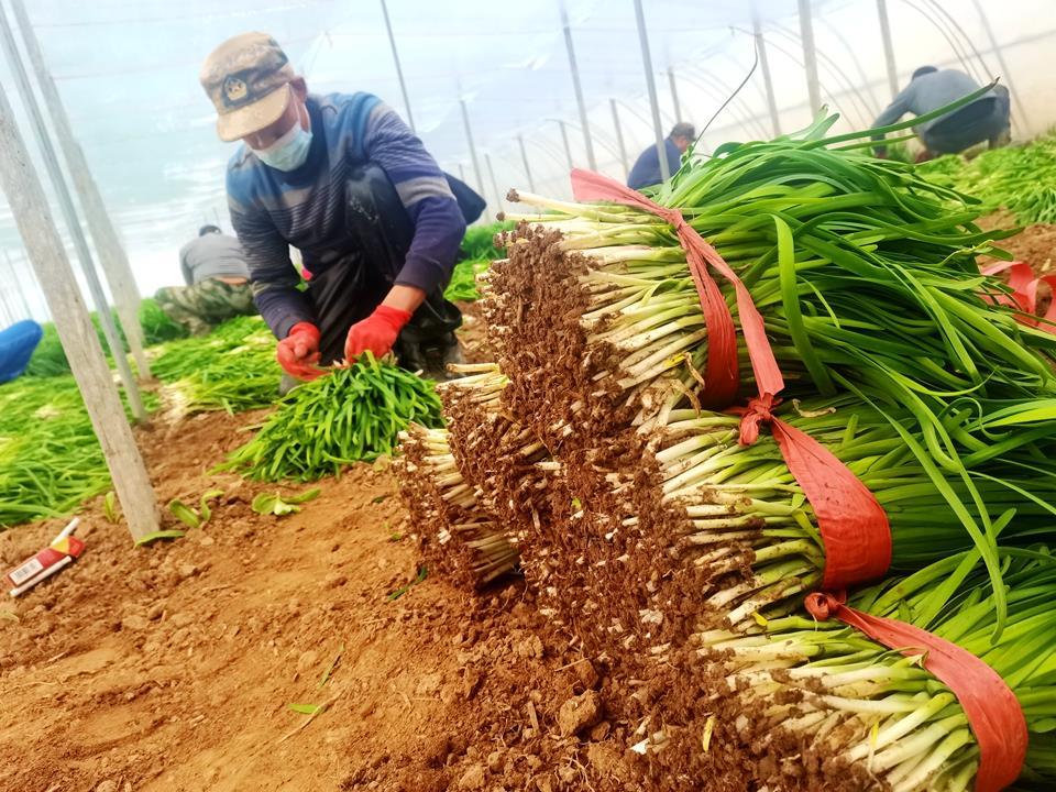 “我家昨天交的是2块8毛一斤,听说今天涨了……”给陈峰帮忙割韭菜的车兴旺一边说一边麻利的捆韭菜。前来帮忙的村民们熟练地把割下来的韭菜捆成大小一样的小捆,整整齐齐码成了一座座小山,等待装车拉走。劳作的间隙,他们纷纷讨论起今年韭菜的价格。