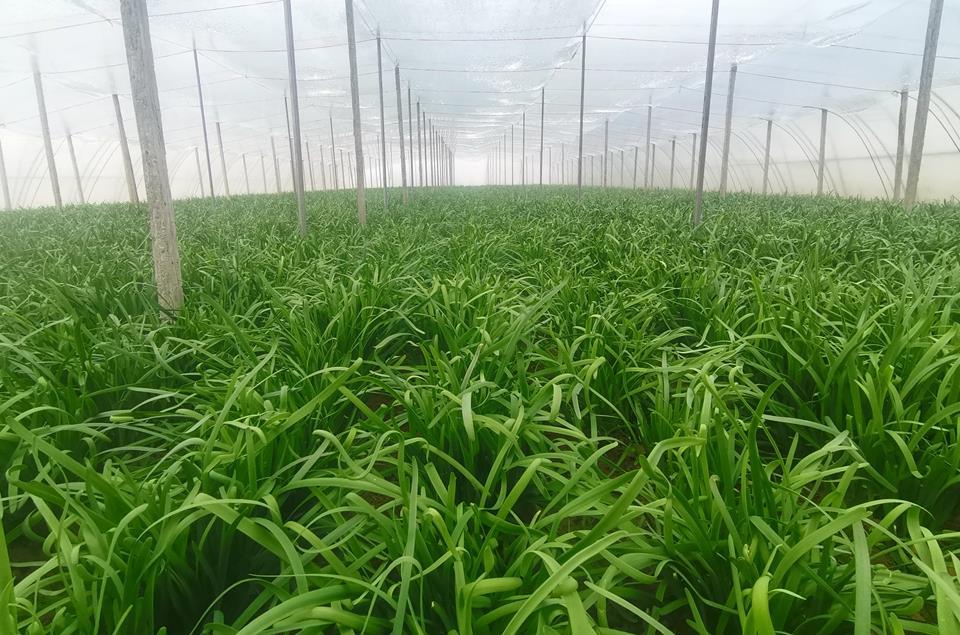 在韭菜种植地山丹镇车岸村蔬菜园区,夕阳余晖染黄了菜农陈峰的韭菜大棚,一尺来高的韭菜绿油油的,长势十分喜人,10多个村民正忙着割菜、打捆、装车,两个多小时的工夫,一大棚的韭菜就收割完毕。