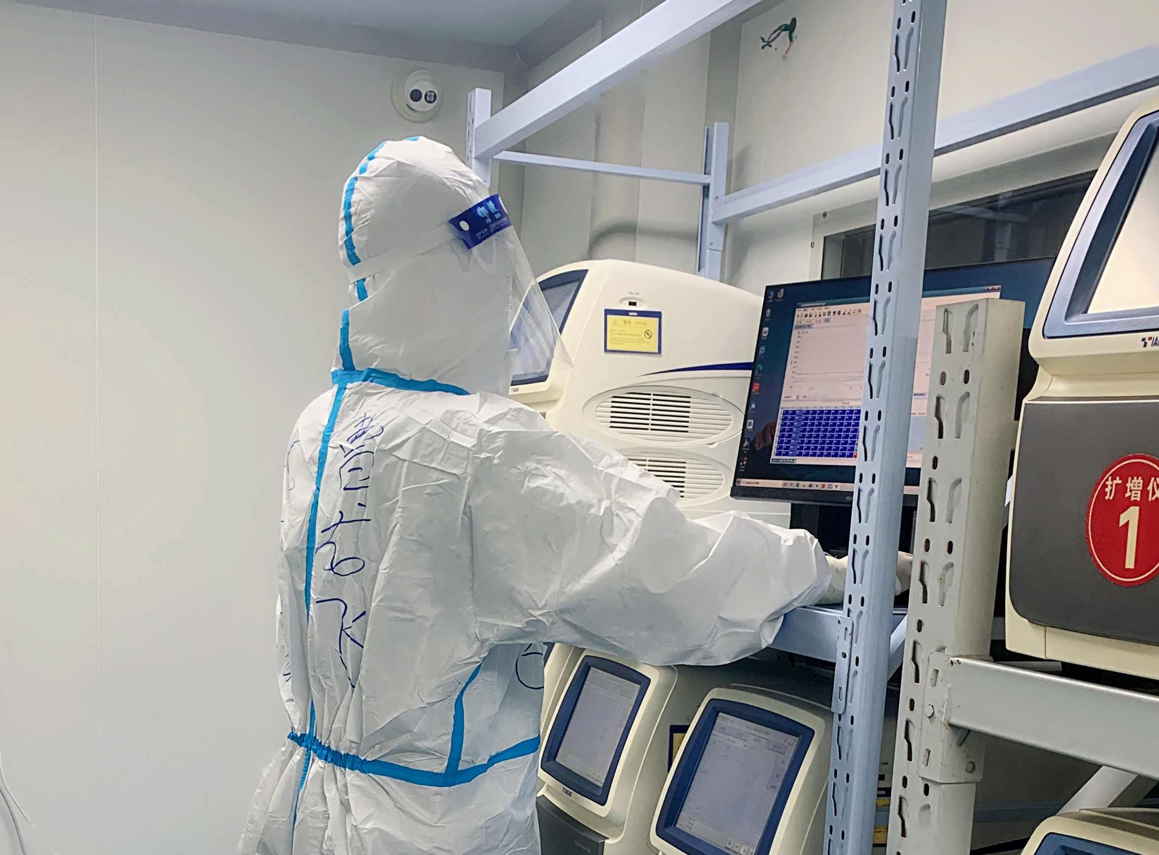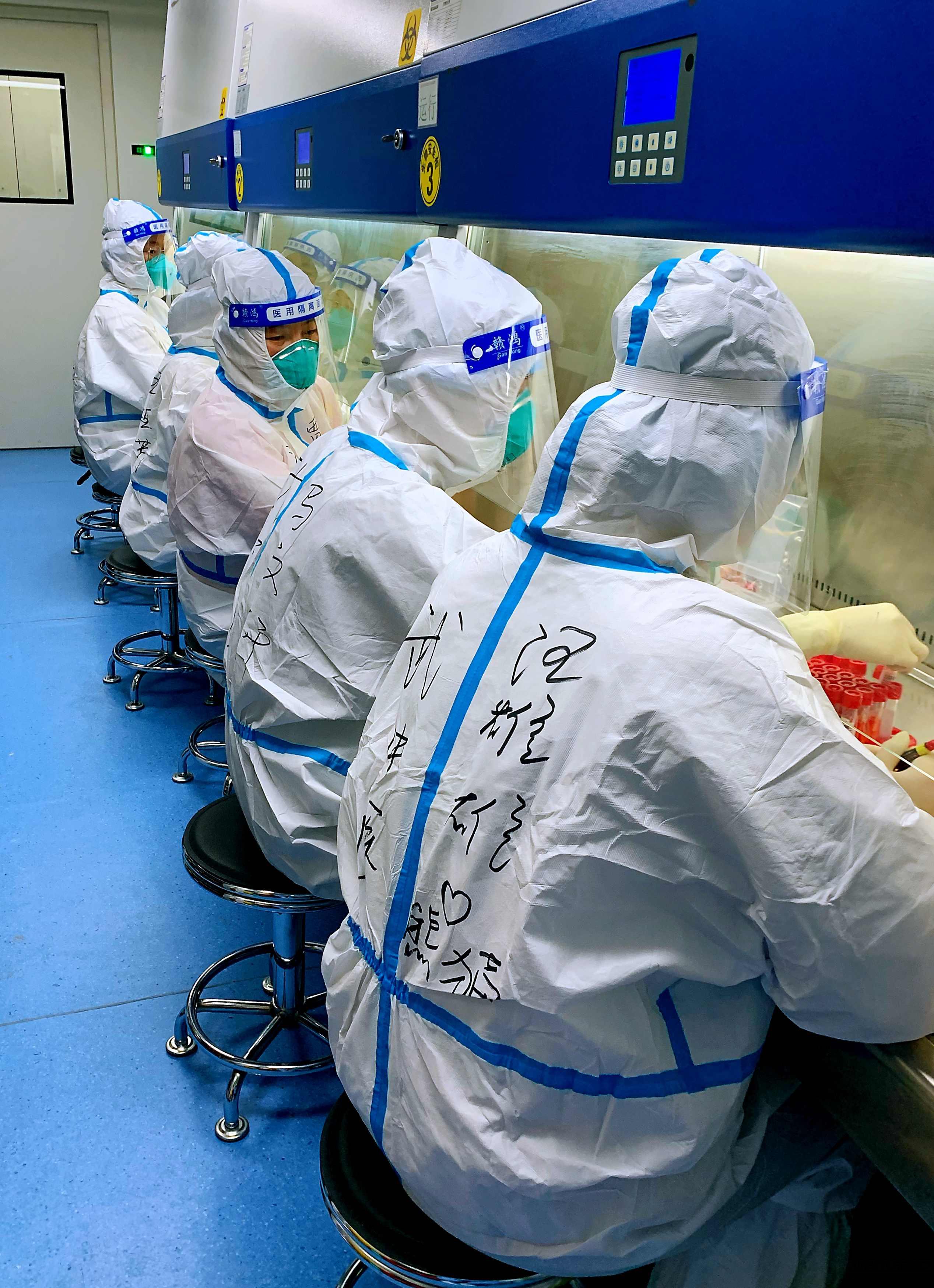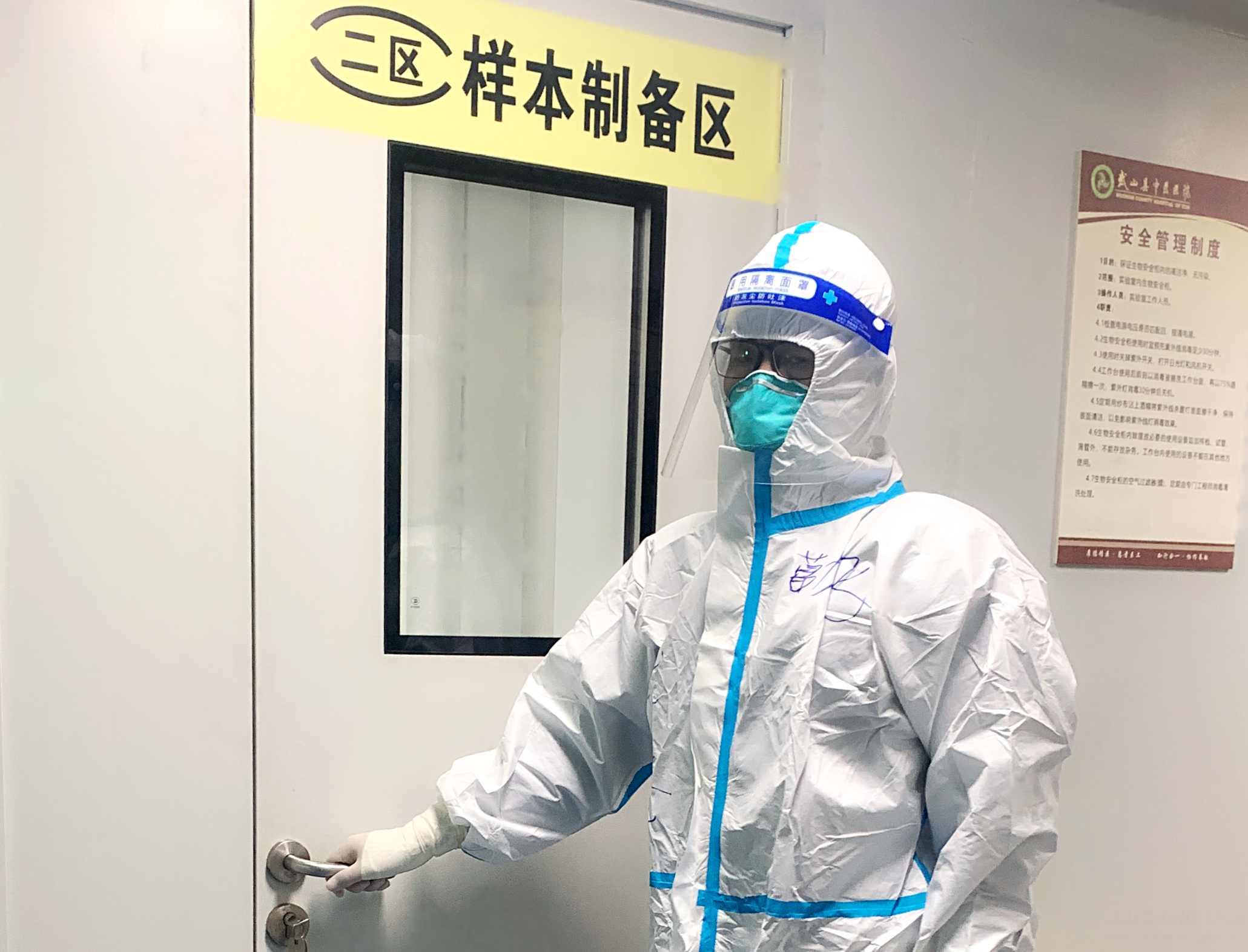 在抗疫历程中,曹龙飞带领着他的“精英”队员坐镇方舱实验室,穿着密不透风的“战衣”,负责核酸标本抽提、上机检测与报告审核。在扩面核酸检测期间,他披星戴月,站在离病毒最近的地方,克服着巨大的压力,超负荷完成了高于平常多倍的检测工作量。