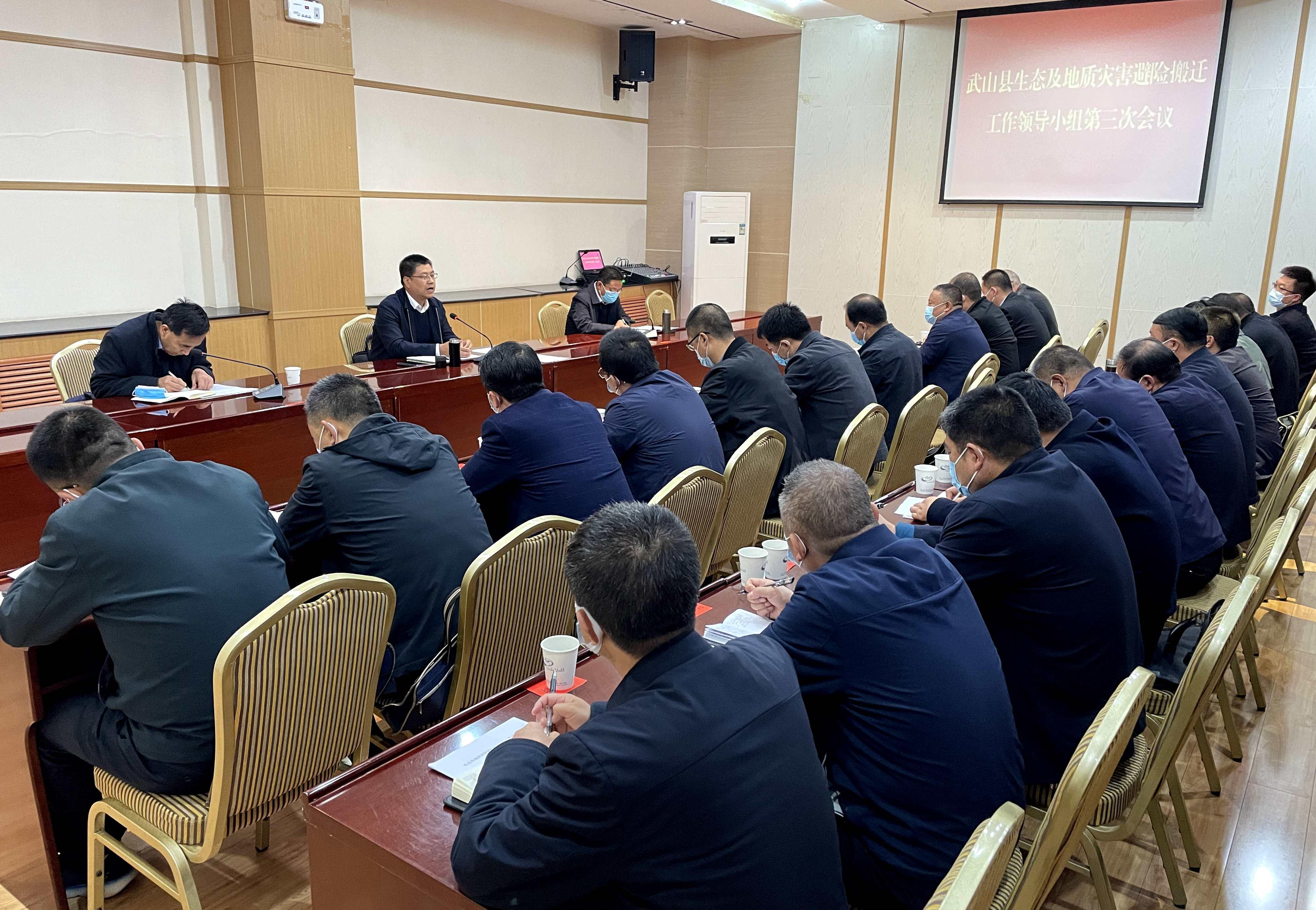 武山县融媒体中心11月4日讯(记者 杨耀斌)11月4日,武山县召开生态及地质灾害避险搬迁工作领导小组第三次会议,县委常委、副县长赵百祥主持会议并讲话,县委常委、城关镇党委书记王想成,县生态及地质灾害避险搬迁领导小组相关部门单位负责人及工作专班成员,各乡镇主要负责人参加会议。