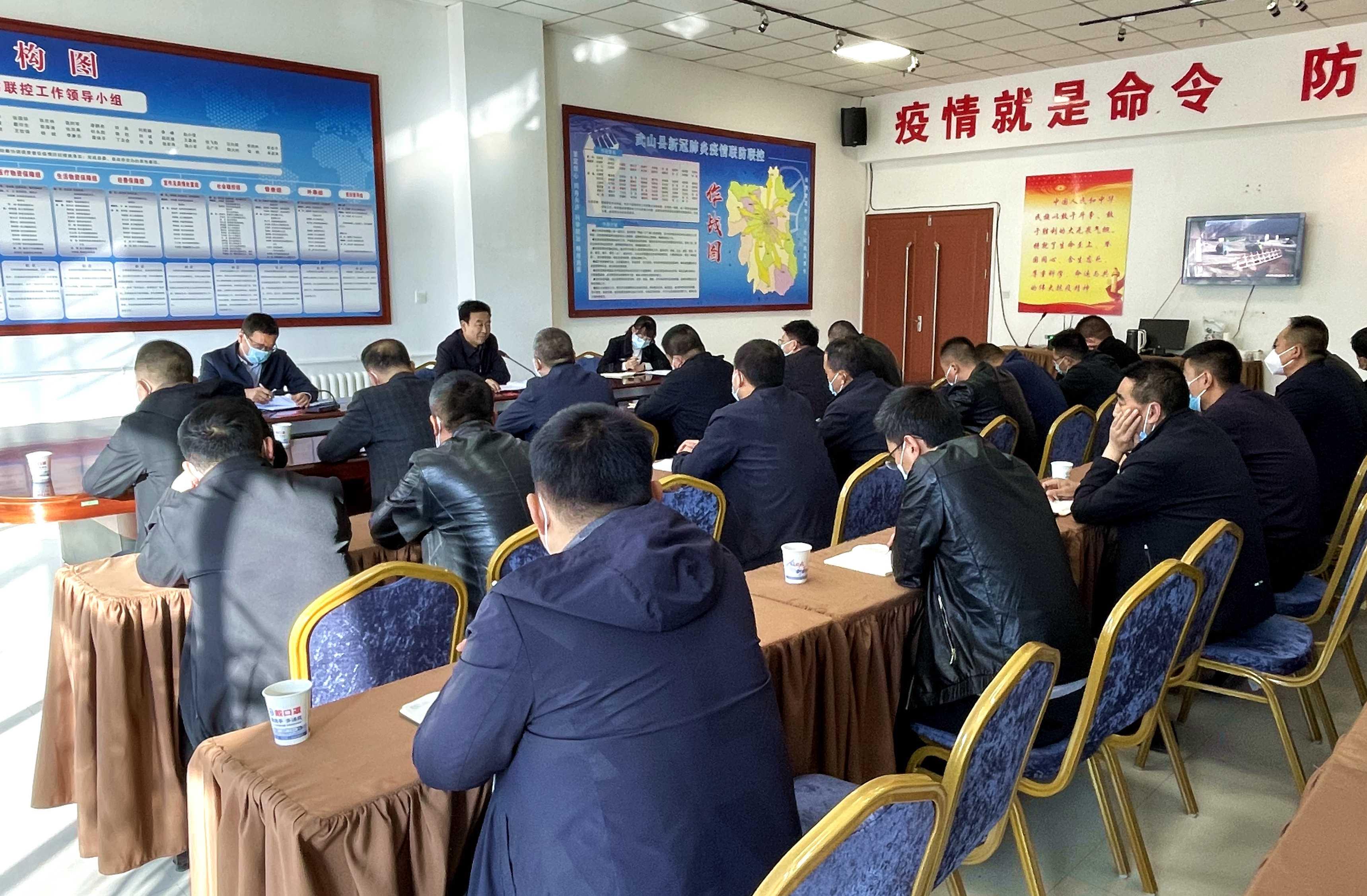 武山县融媒体中心11月1日讯(记者 王继明 李永祥)11月1日,武山县召开疫情防控交通检疫组工作推进会,分析研判当前疫情防控形势,安排部署交通检疫工作。县委常委、政法委书记令军强出席会议并讲话,县委常委、宣传部部长胡丽霞主持会议,副县长李峰传达了相关文件精神。县疫情防控交通检疫组成员单位、各交通查验点负责人参加会议。