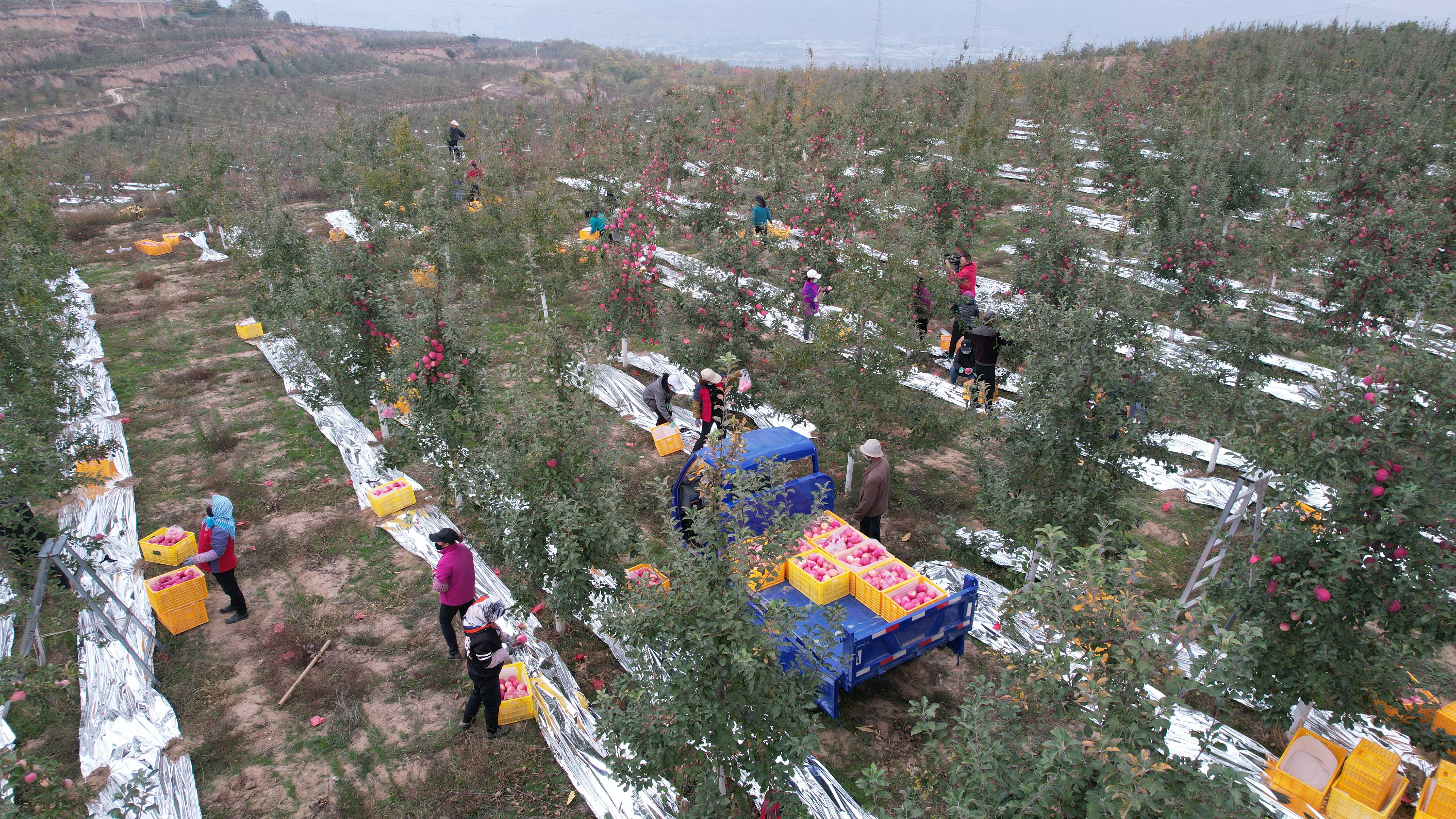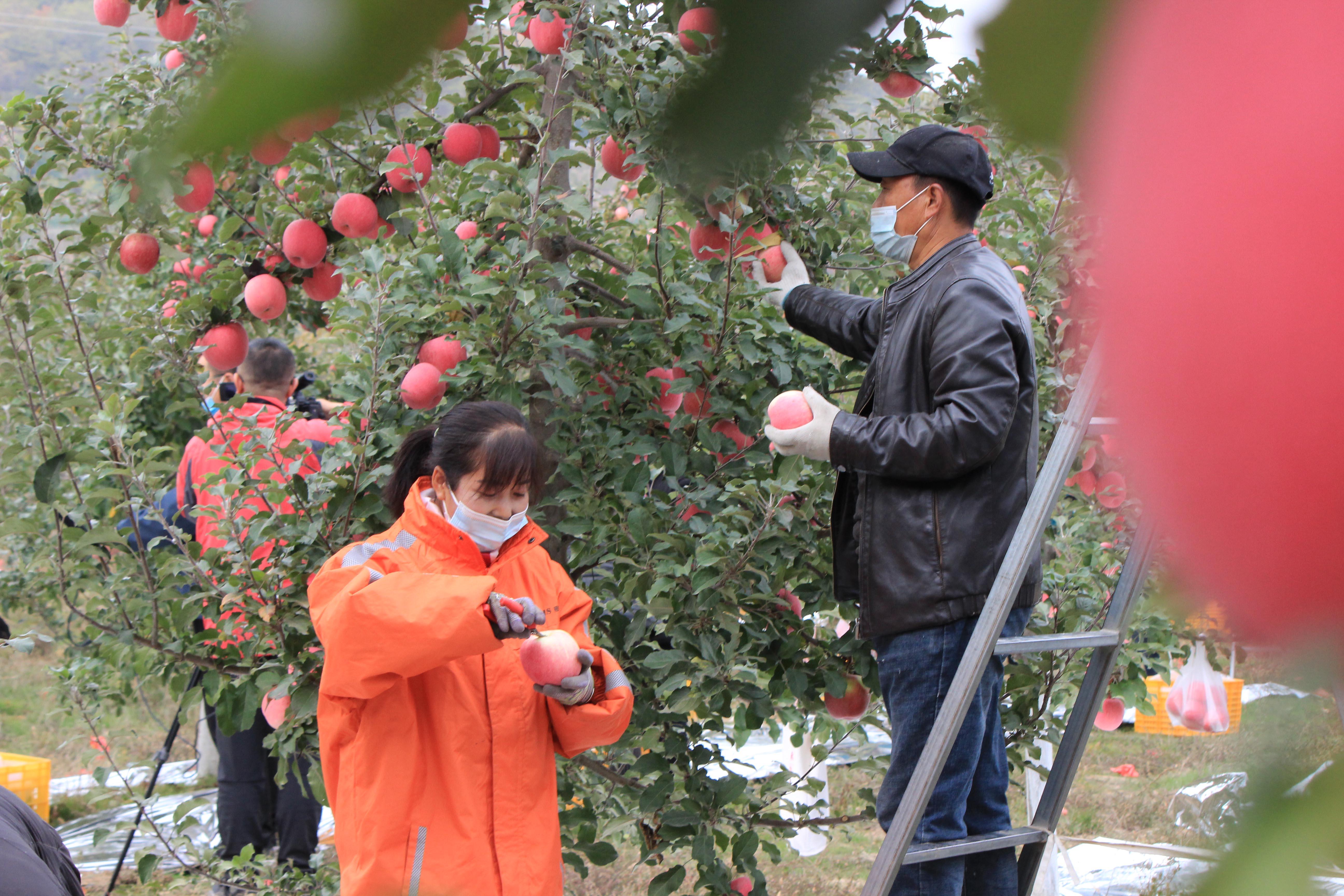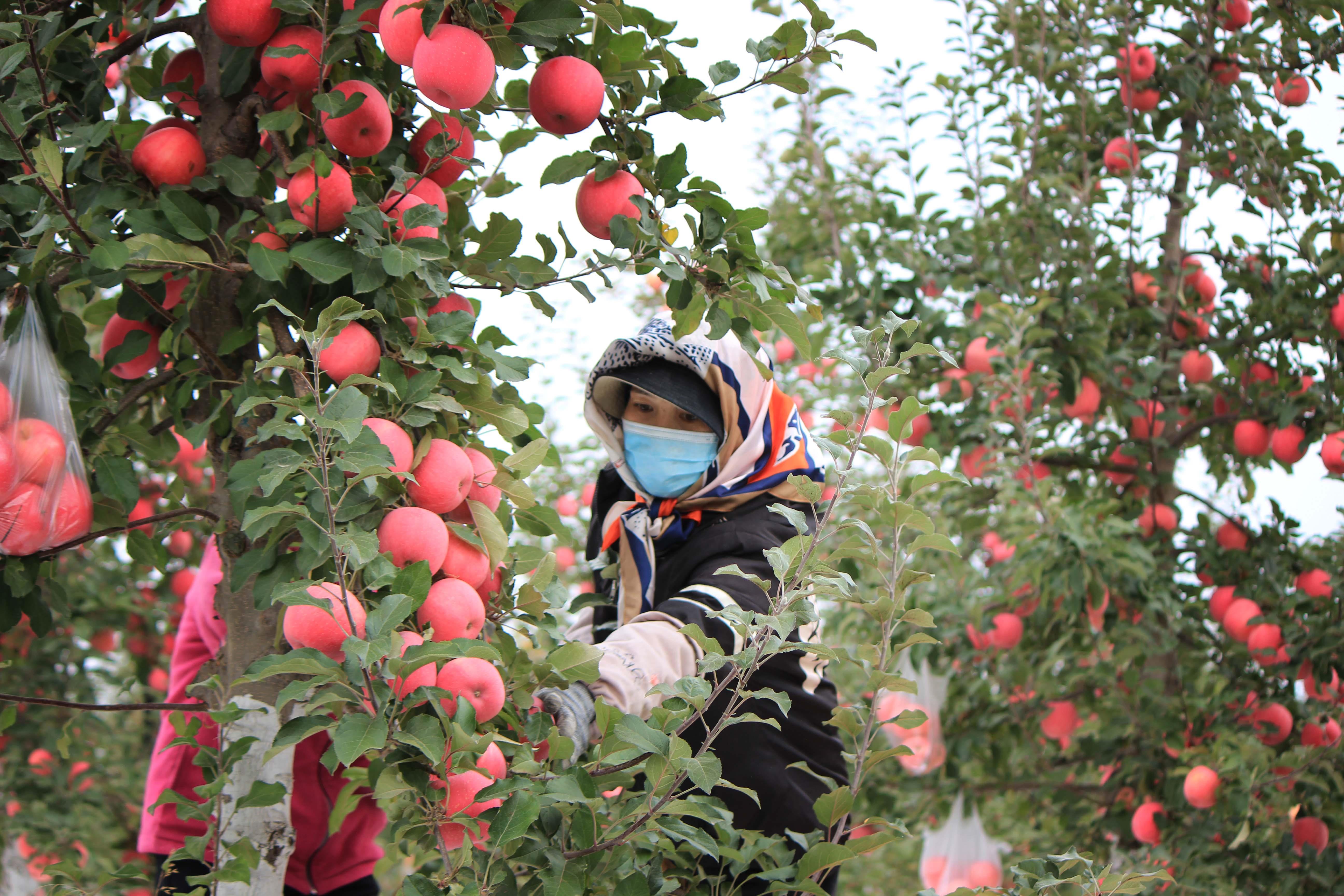 这几天,苹果红透需要大量的采摘工,周边的群众利用空闲来采摘,在享受丰收的同时也挣了零用钱。“一天能挣50块钱,也挺好,做零花钱。我是照看学生的,下班了还能给娃娃赶上做饭。这个活还好,我也爱干。”洛门镇东街村村民康淑巧和同伴每天早上八点半被接到基地,十一点准时下班,下午两点上班,五点下班,让她们在家门口挣了钱,也不耽搁家里的事。