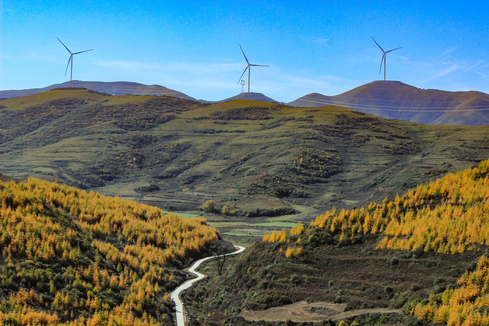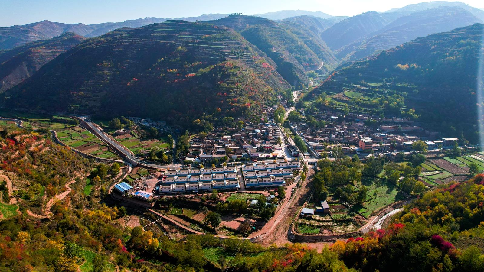 树树皆秋色,山山如诗画。金秋时节,温泉境内俨然是一个童话般的世界。树叶红的胜火,黄的似金,绿如翡翠,如同山坡披上五彩嫁衣,光彩夺目,在秋风之中尽显大自然秋日的美妙。远山层峦叠嶂,近村安静祥和,山峦之间,蓝天之下,好一幅秋山如火,碧水如黛的绚丽渭川秋韵图。