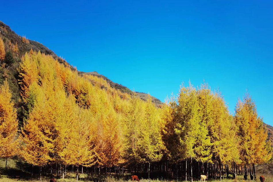 穿梭在雪坪滩,金黄色枝叶交织成密密匝匝的叶网,满地金黄,温馨而浪漫,让我们走进美丽的李子沟雪平滩,观层林尽染、赏五彩斑斓。