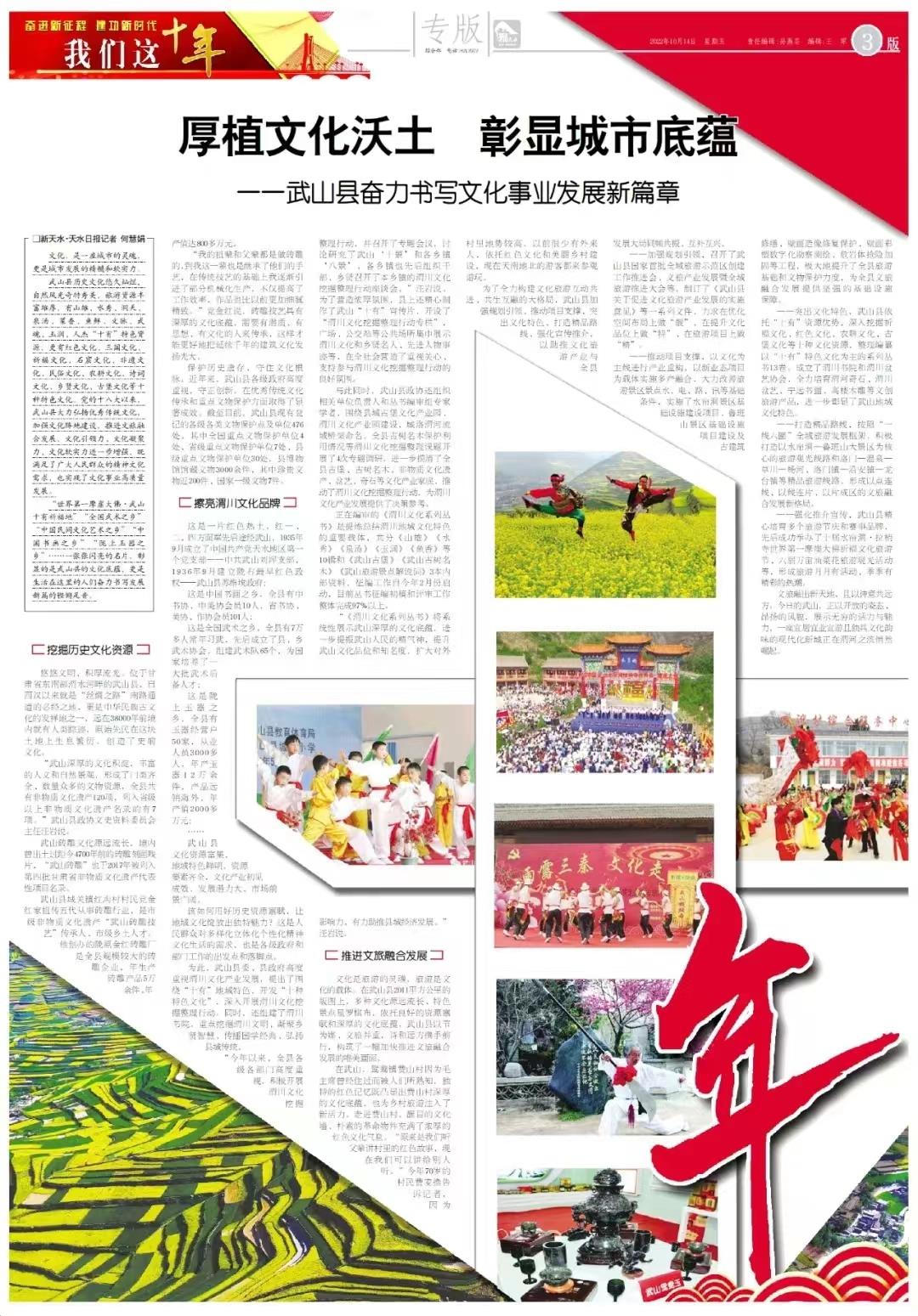 “世界第一摩崖大佛·武山十有祈福地”“全国武术之乡”“中国民间文化艺术之乡”“中国书画之乡”“陇上玉器之乡”……一张张闪亮的名片,彰显的是武山县的文化底蕴,更是生活在这里的人们奋力书写发展新篇的铿锵足音。