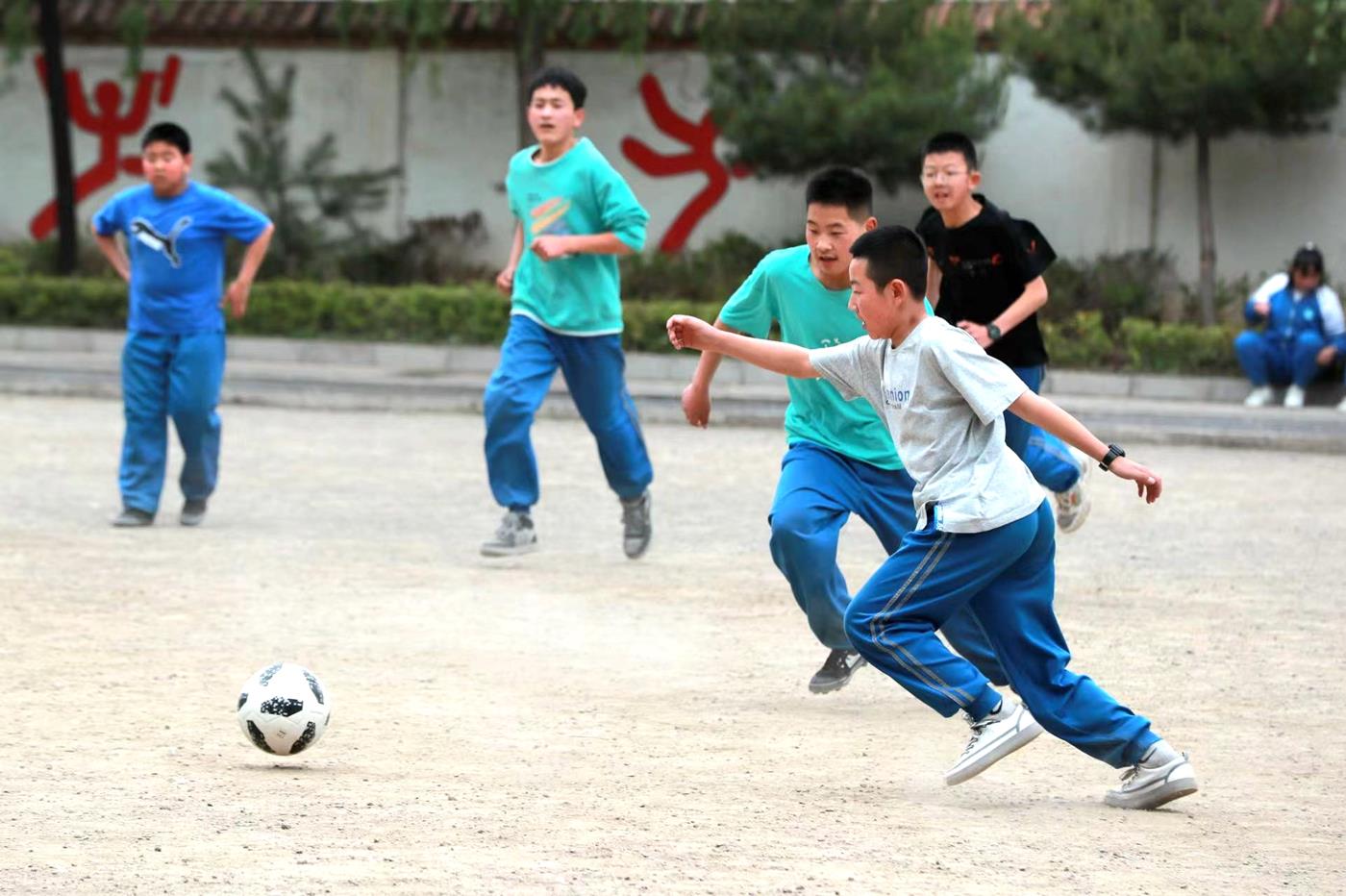 科学规化精布局,多彩课间促融合。学校因地制宜,合理规划体育场地,在有限的条件下丰富体育元素。主要依托体育课堂、大课间、课后服务及课外社团开展一系列体育活动,形成学校体系化体育教育,加快学校体教融合改革步伐。大课间时间,七、八、九年级根据运动项目特点,科学划分训练区域,分年级有层次地开展体育活动。课后服务时间,按照每班每周2节体育课开展兴趣班活动,全力保障学生达到每天运动1小时。