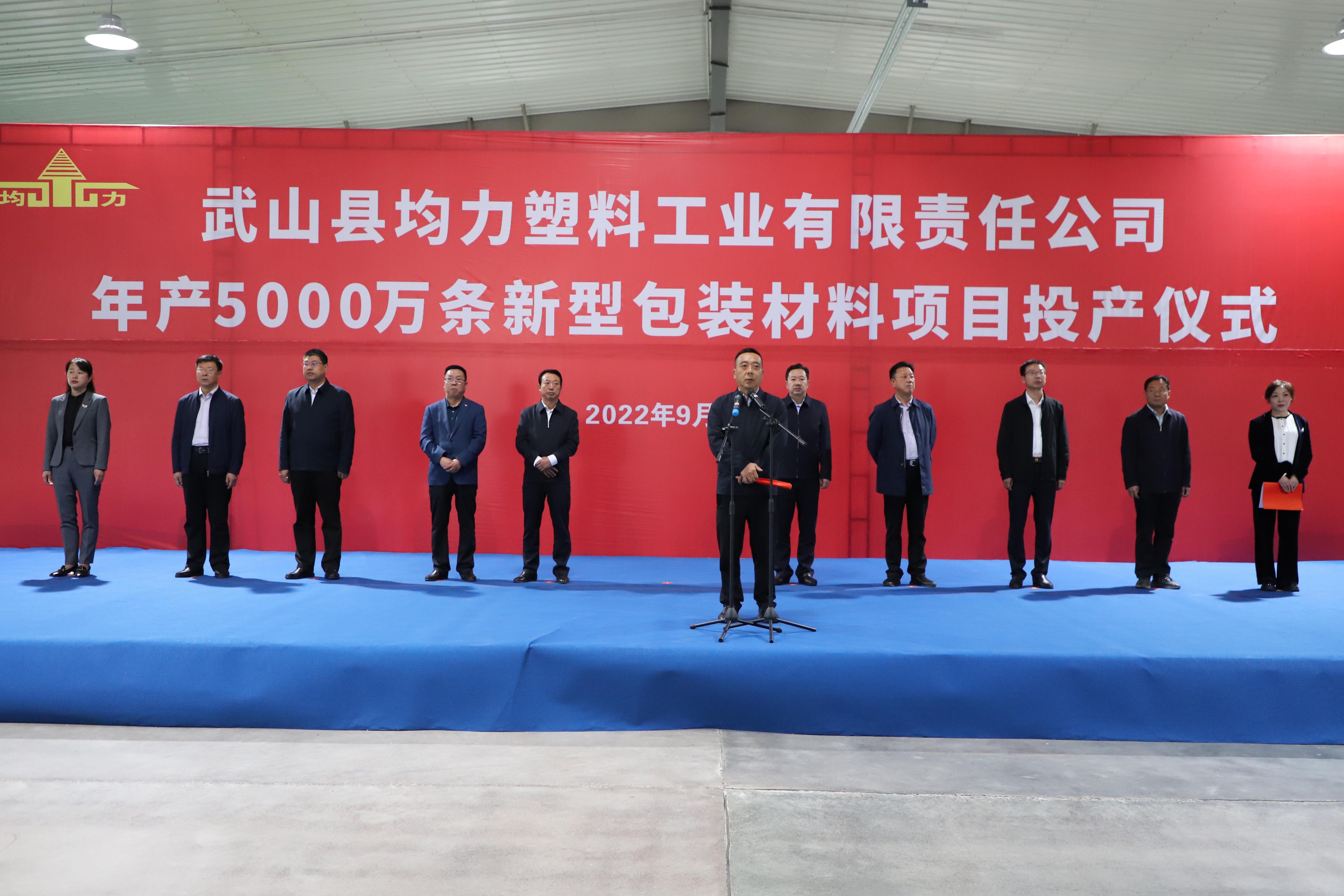 9月21日,武山县举行均力塑业年产5000万条新型包装材料项目投产仪式。县委书记王新强出席并宣布均力塑业年产5000万条新型包装材料项目正式投产,县委副书记、县长王志成讲话,县人大常委会主任孙德银,县政协主席庞明全,县委常委、统战部部长李森,县委常委、副县长赵百祥,县委常委、城关镇党委书记王想成,县人大常委会副主任郭海涛,县政协副主席党荣华,甘谷祁连山水泥有限公司总经理张明出席投产仪式,副县长刘莉娜主持仪式。