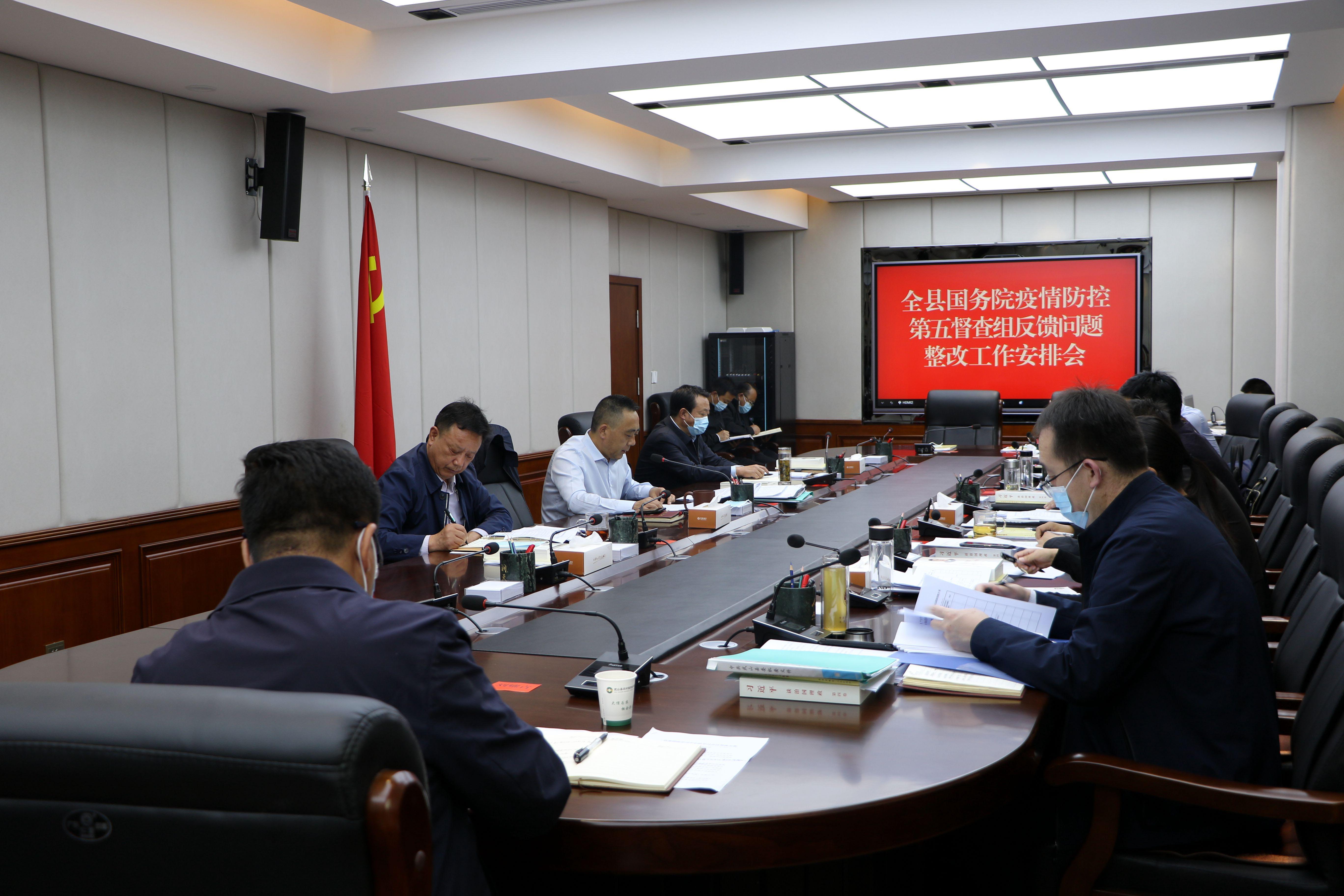 王新强在讲话中强调,全县各级各部门要把国务院第五督查组督查反馈问题整改作为一项重大政治任务,提高站位抓整改,自觉从政治的高度来认识督查整改工作,精心安排、周密部署,全力抓好反馈问题整改落实。要细化措施抓整改,逐条对照认领反馈问题,认真制定任务清单,明确完成时限,完善整改措施,确保反馈问题不折不扣全部整改落实。要靠实责任抓整改,压紧靠实各级整改责任,形成齐抓共管工作合力。要从严督查抓整改,加大明查暗访力度,做到件件有回音、事事有落实。要加强常态化疫情防控,坚持“外防输入、内防反弹”总策略和“动态清零”总方针不动摇,做到思想认识再警醒,坚决消除麻痹思想、厌战情绪、侥幸心理和松劲心态,持续巩固疫情防控成果。要做到卡口管理再规范,严格落实“一问一扫三查两落”等措施,严把外防输入第一道关口。要做到人员排查再精细,加大涉疫地区来县返县人员排摸,建立详实数据台账,确保不漏一户一人。要做到核酸检测再精准,加强建筑工地、医疗机构等重点领域核酸检测,确保应检尽检、应检全检。要做到重点场所再严格,加强汽车站、火车站、商场超市、旅游景点、宾馆酒店等重点场所管控,严格落实“一扫三查”等措施,全面消除疫情传播风险。要做到防控责任再靠实,压紧四方责任,落实24小时值班值守制度,确保全县疫情防控不出任何问题。要做到舆论宣传再深入,按照县委管干部、干部管家属、家属管亲朋“三管”工作要求,教育引导群众非必要不出县、不返县,加强政策宣传,加大舆情监测,努力营造良好舆论环境。