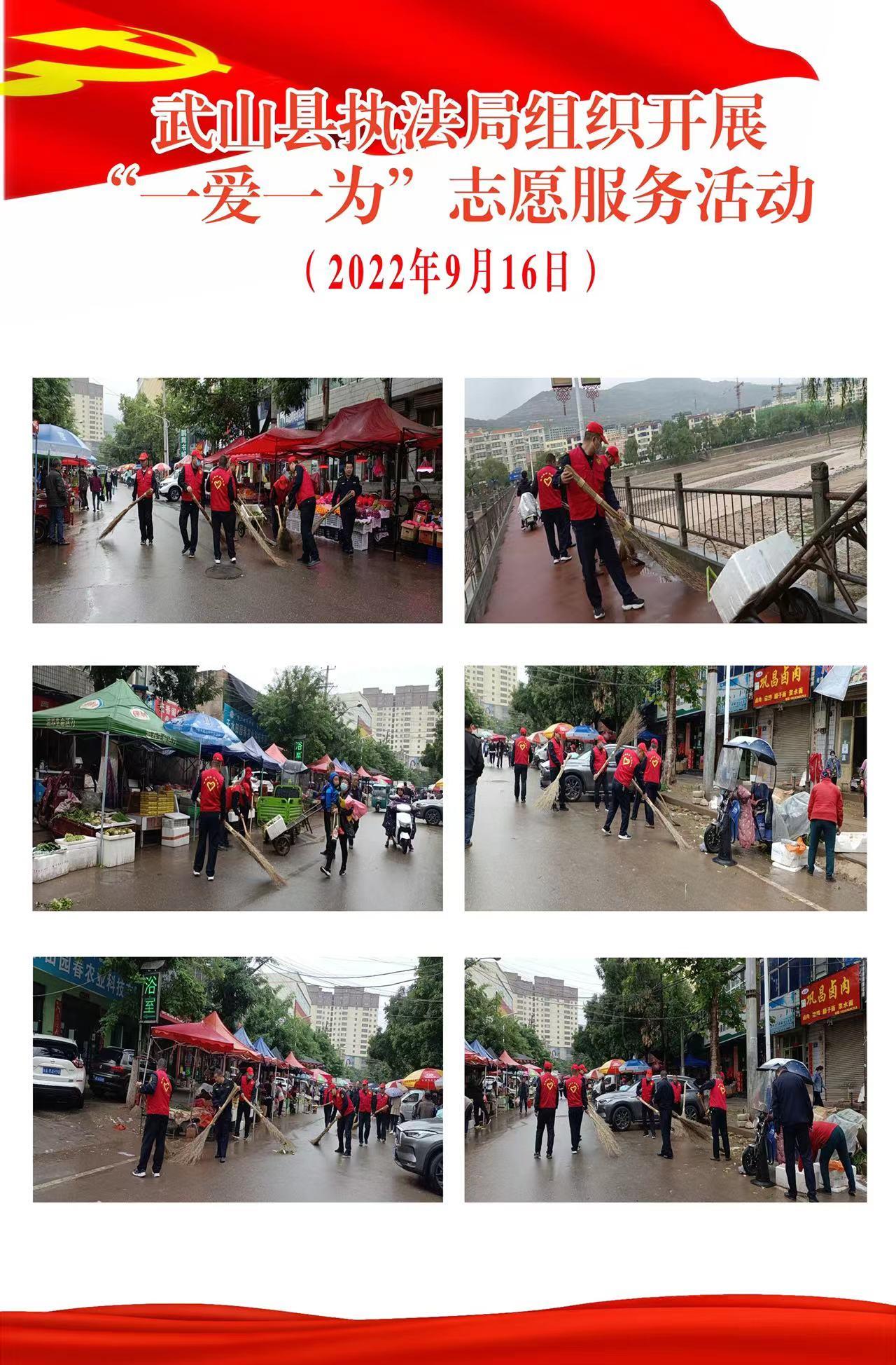 9月16日,武山县各乡镇各部门各单位干部职工大力弘扬“奉献、友爱、互助、进步”的志愿服务精神,冒风雨深入各自包抓区域开展“一爱一为”志愿服务活动,进一步引导群众、凝聚群众,不断提升市民文明素养、居民生活质量和全社会文明程度。