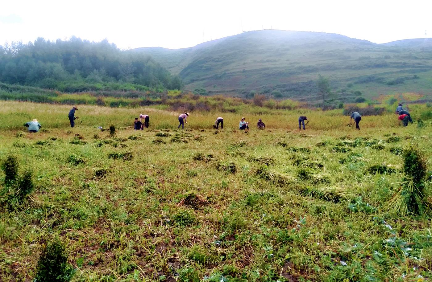武山县融媒体中心9月13日讯(记者 康正东 郭永强 赵超 王继明)秋收时节,苦荞已进入收获期,在武山县温泉镇李子沟村的苦荞种植基地,村民们正干得热火朝天,他们卖力挥动着镰刀,收割、打捆、转运、晾晒……一片繁忙的秋收景象。