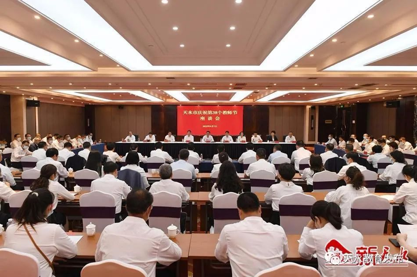 9月7日下午,天水市庆祝第38个教师节座谈会召开。市委书记冯文戈出席会议并讲话,市委副书记、市长王国先主持会议。市领导张建杰、王燕、王东红、张晓强、张庆利、汪小娟出席会议,各县区委书记、教育部门负责人参加会议,5位优秀教师和教育工作者代表分别发言。