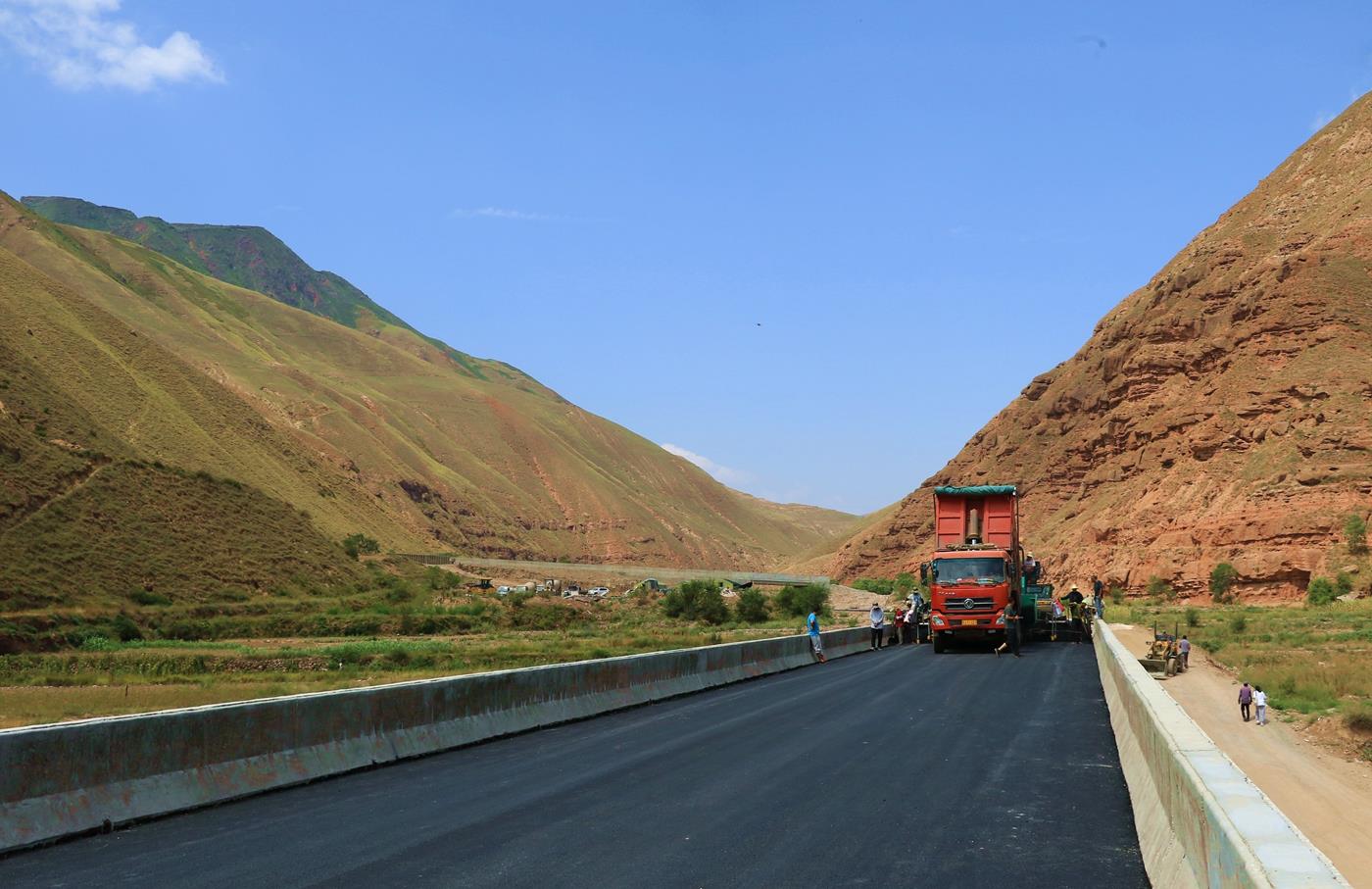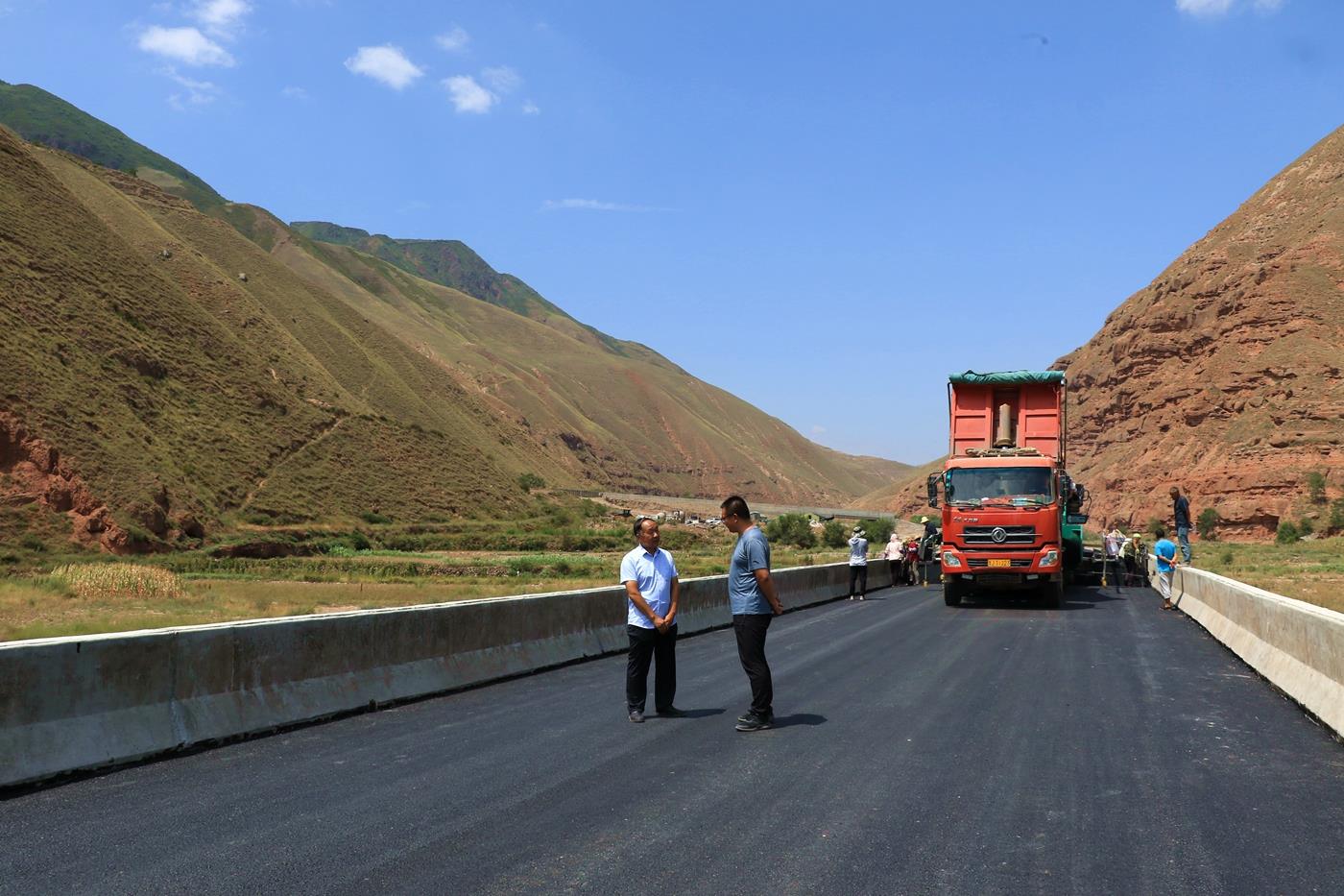 武山县融媒体中心8月18日讯(记者 郭永强 赵超 管秋勇 颉宏斌 蒲爱民 康正东)8月16日,记者在武山县丁家门至漳县孙家峡公路(高楼镇高窑村至漳县孙家峡村段)项目建设现场看到,一辆沥青摊铺机正在铺设高窑村附近一座大桥的路面。据现场负责人介绍,该工程将于月底完工通车。