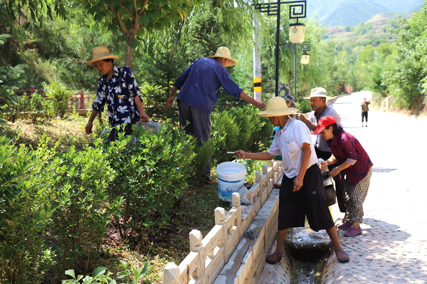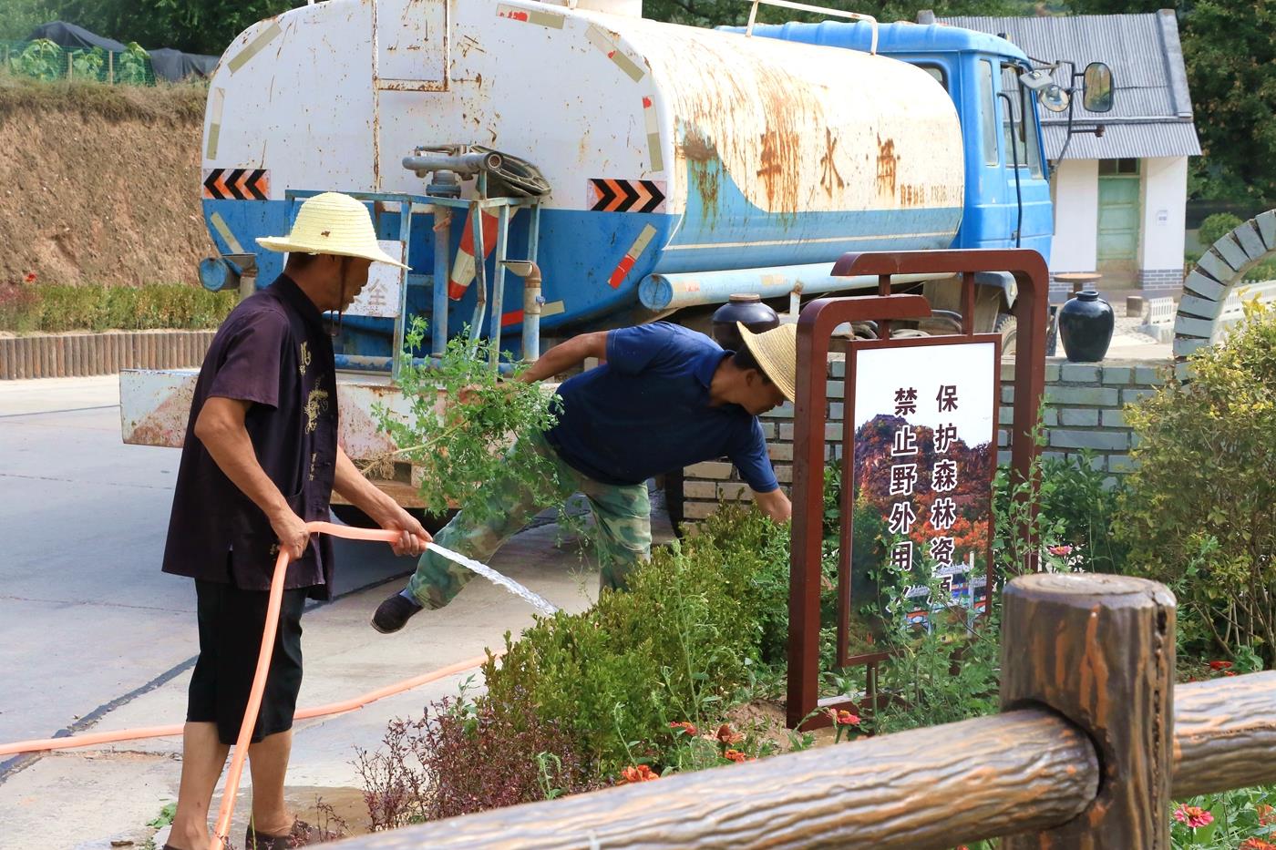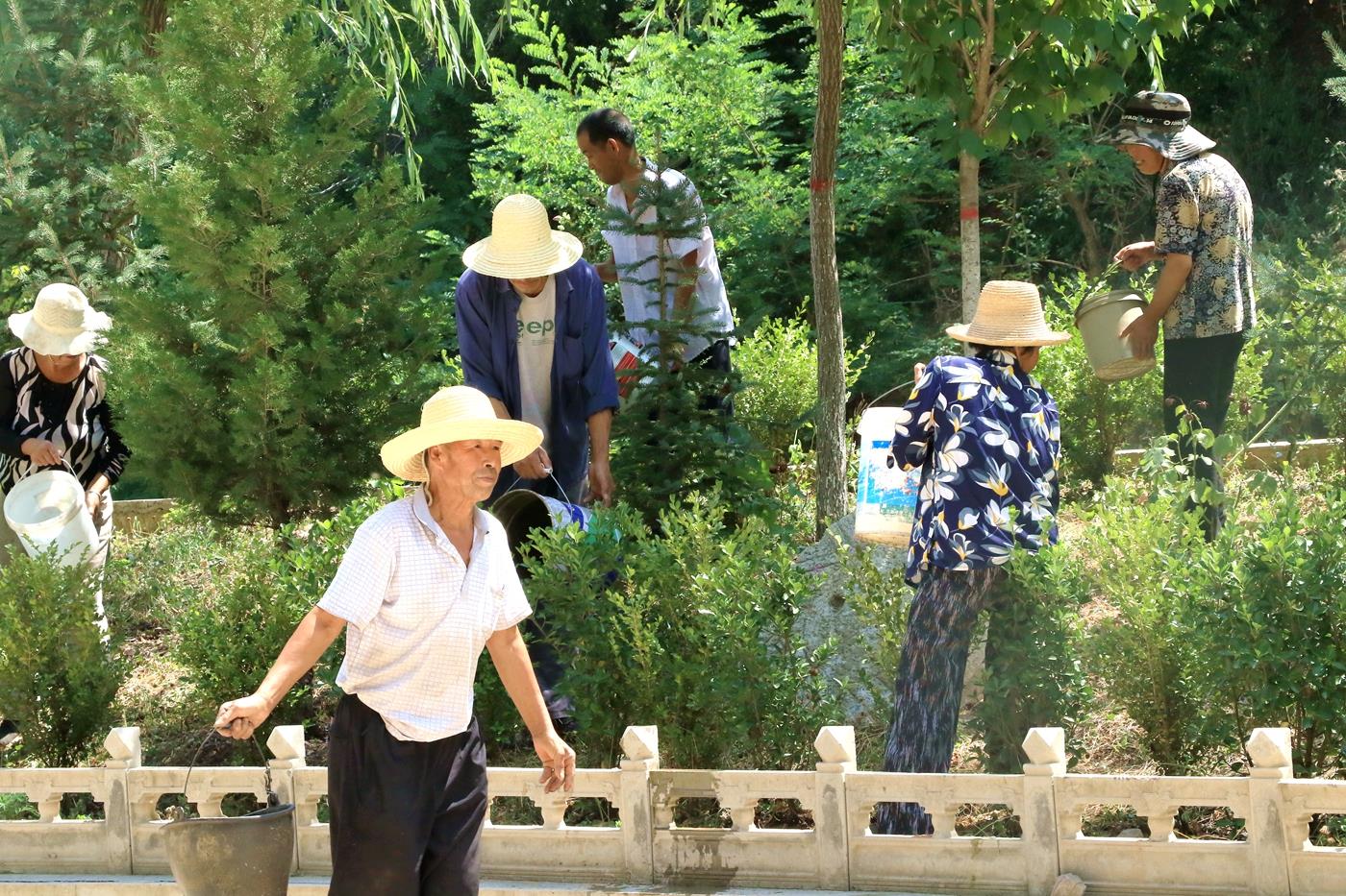 头顶烈日,手提水桶,在城关镇上沟村,党员、群众每天对1.5公里绿化带里的花草树木进行浇水,有效缓解树木旱情,确保苗木成活。“今年特别干旱,听到号召,很多人自发带上家里的水桶给花草树木浇水。村庄面貌改善来之不易,享受的过程中,也应该主动承担责任保护家园里的每一棵花草树木,大家齐心协力,共渡难关。”上沟村村民、老党员张调来说。