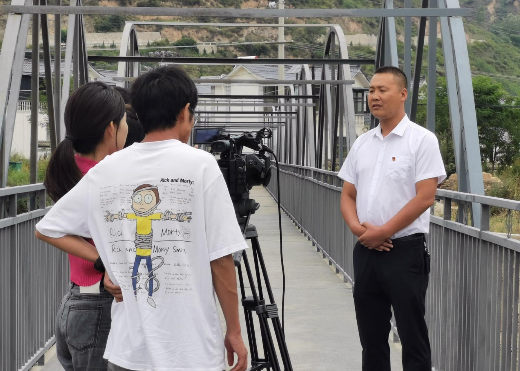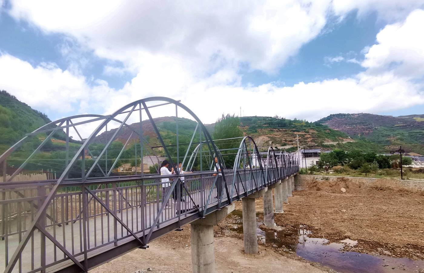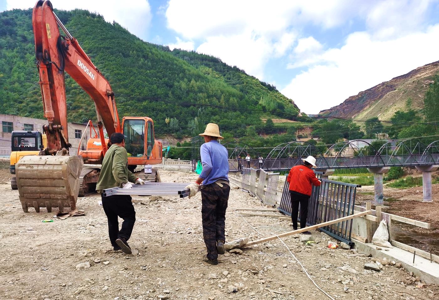 在杨河村惠通桥上,油漆工人正在油漆围栏,杨河镇党委委员、副镇长杜郁明说,近年来,杨河镇紧紧围绕项目建设助推经济社会发展,争取项目资金修建了这座钢架结构仿黄河铁桥,桥长64米,宽2.99米,9墩,联通杨河镇区与杨河新村,不仅极大地方便了群众的出行,有力提升了镇区周边人居环境水平,还为镇区打造了人文景观。惠通桥取自“惠风和畅,通达天下”两个成语,寓意杨河在党的领导下,风调雨顺,蒸蒸日上。