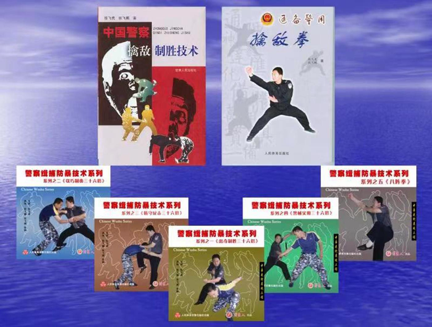 张飞虎在习武之余,学术上也一路精进,展现了他学文的天赋,他不但是警院教授,还曾是警院学报副主编,除了先后出版的4部学术专著外,还录制了“警察缉捕防暴技术”系列教学光碟,在国内外发行,并有一项科研成果申报为国家专利。一位武术名家,在学术上有如此骄人的成就,实属不易。治学之余,张飞虎还分别在《甘肃公安》和《兰州公安》杂志上创办并主持《招招制敌》与《实战练兵》栏目,解说并实战演练制敌招法。专著《中国警察擒敌制胜技术》一书2010年被公安部评为“全国公安机关优秀培训教材”,书中首次提出了“军队擒敌技术和警察擒敌技术相殊差别”的观点,并对擒敌技术的每一招法进行了生理学、生物力学的分析,从而科学地将擒敌术上升到一个新的理论与实战融通的高度。更为可贵的是,《中国警察制胜技术》将法律精神融入其中,使招法的运用有了法律依据,尽显法制社会的时代精神,也与文明社会的要求不谋而合,将警察擒敌技术与实用法律无缝衔接。针对警察沿袭军队擒敌拳无主体身份特点之不足,创编了首套以警察擒敌技术为主体内容的擒敌拳——《通备警用擒敌拳》,填补了公安机关无警用擒敌拳的空白。2021年,作为建党100周年的献礼,张飞虎与其挚友张勇先生联袂出版《维稳中国》,为国家反恐维稳工作贡献了绵薄之力。