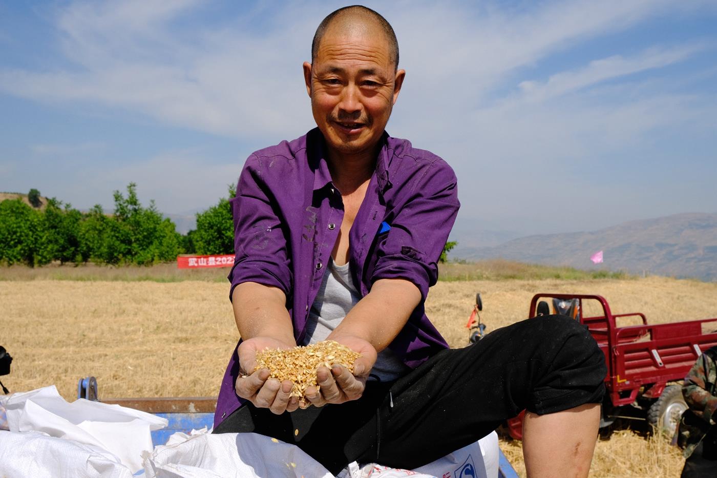 城关镇弟娃农机专业合作社的拖拉机手邓森林一早就在麦田里为农民收割麦穗。“今年国家的政策好,小麦全程托管分四个环节,种、耕、收、防这四个环节国家今年给农户补助100块钱,降低了种植成本。”