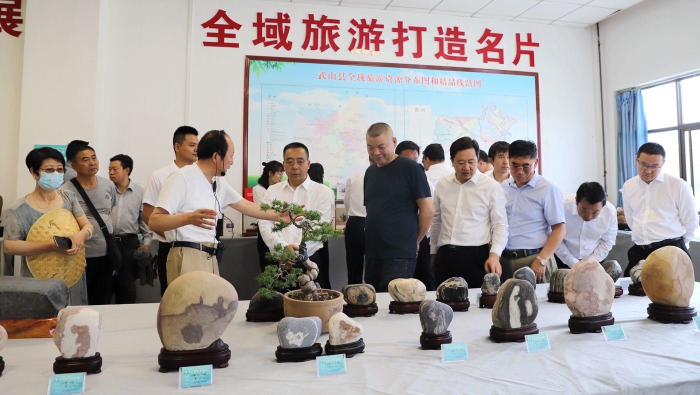 6月21日,“物华天宝·渭川遗韵”首届七县奇石联展在武山县开展。县委书记王新强宣布联展开展,并与县委副书记、县长王志成,县人大常委会主任孙德银,县政协主席庞明全共同为武山县十个文艺家协会揭牌。县委常委、宣传部部长胡丽霞介绍首届七县奇石联展情况和武山县文旅产业发展情况。副县长李峰主持开展仪式。中国观赏石协会陨石专委会副会长、宝鸡市奇石博物馆馆长秦泗省,甘肃省观赏石协会常务副会长张荣光,武山县观赏石协会会长唐友先作发言。