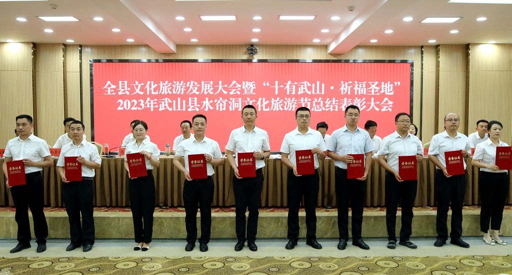 武山县融媒体中心讯(记者 赵超 车彤瑶)7月5日,武山县召开全县文化旅游发展大会暨“十有武山·祈福圣地”2023年武山县水帘洞文化旅游节总结表彰大会,深入贯彻全省文化旅游发展大会精神,安排部署全县文化旅游发展工作。县委书记王新强出席会议并讲话,县委副书记、县长王志成主持会议。县人大常委会主任孙德银,县政协主席庞明全及县四大班子其他在家领导,各乡镇、县直相关部门、驻县有关单位和县内景区景点、行业协会负责人参加会议。