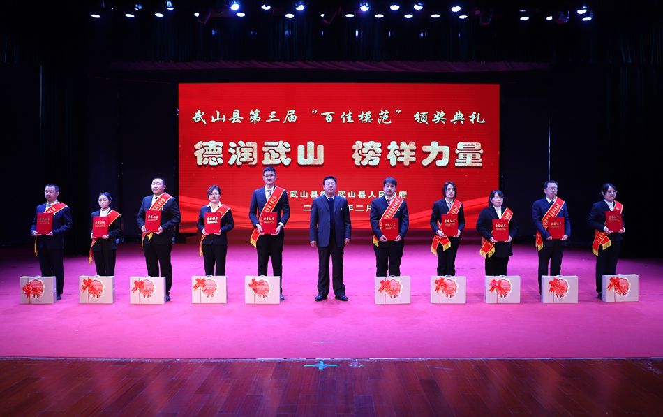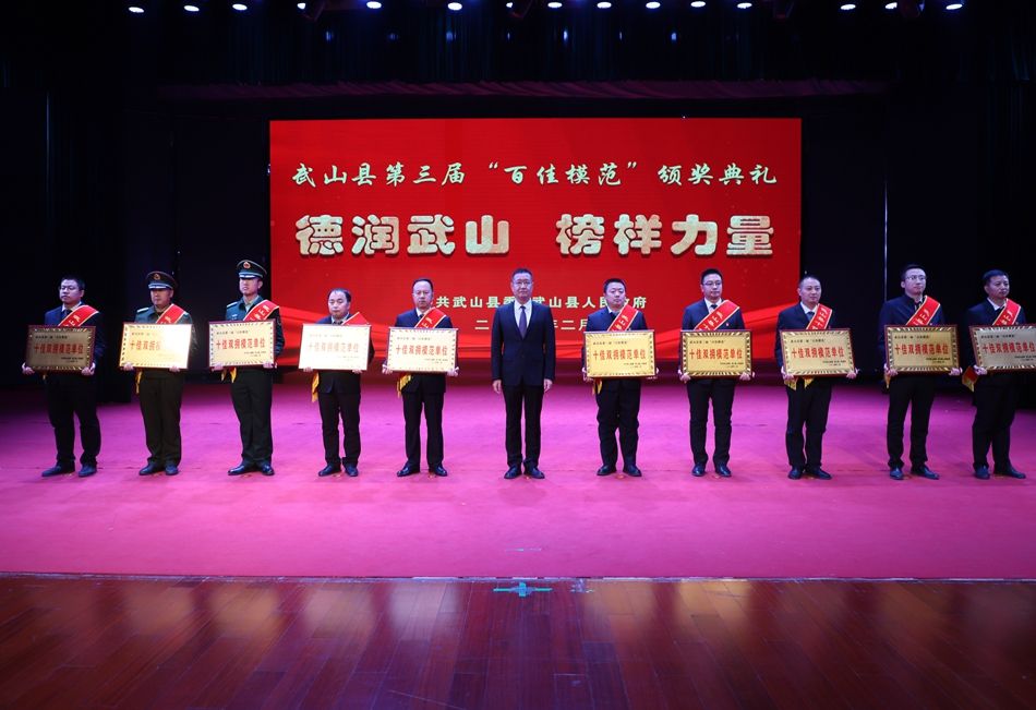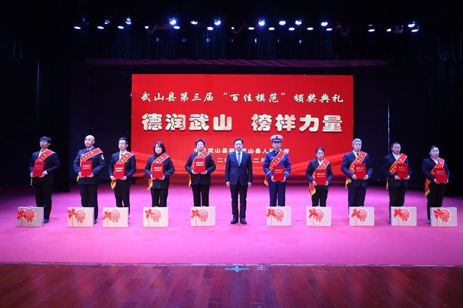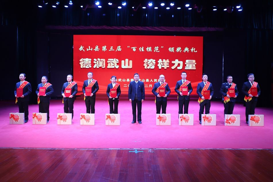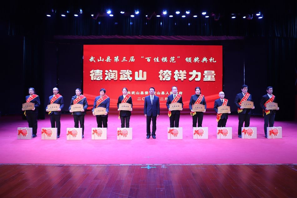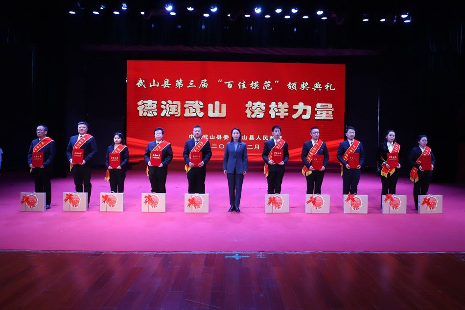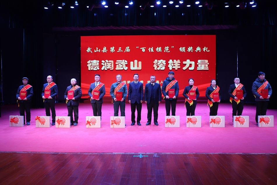 县委副书记赵百祥宣读了《中共武山县委 武山县人民政府关于表彰武山县第三届“百佳模范”的决定》,典礼表彰了“十佳和美乡村”“十佳村级集体经济示范村”“十佳农民专业合作社示范社”“十佳诚信经营主体”“十佳企业”“十佳全域旅游创建先进集体”“十佳主动创稳先进集体”“十佳双拥模范单位”“十佳文明家庭”“十佳社团组织”等十类先进集体和“十佳武山好人”“十佳劳动模范”“十佳新时代好少年”“十佳科技工作者”“十佳生态环保卫士”“十佳渭川文化传承保护人”“十佳综治标兵”“十佳结对关爱行动先进个人”“十佳驻村帮扶队员”“十佳优秀干部”等十类先进个人。
