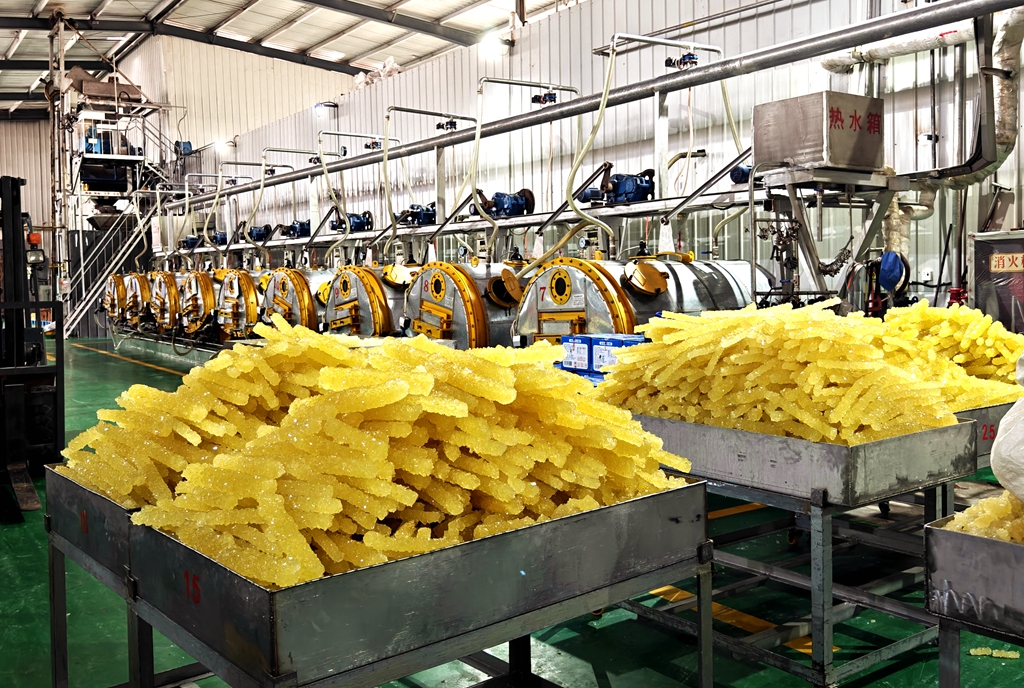 在广丰糖业有限公司生产车间,“甜蜜”事业干得热火朝天,一些工人正在分割冰片糖,一些工人则将金黄的冰糖运往装箱区,现场忙碌而有序。