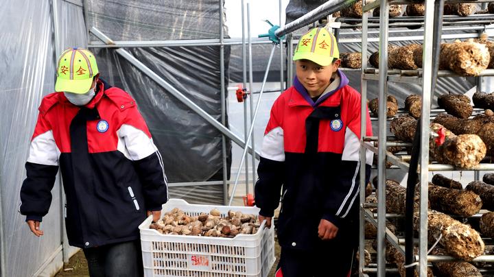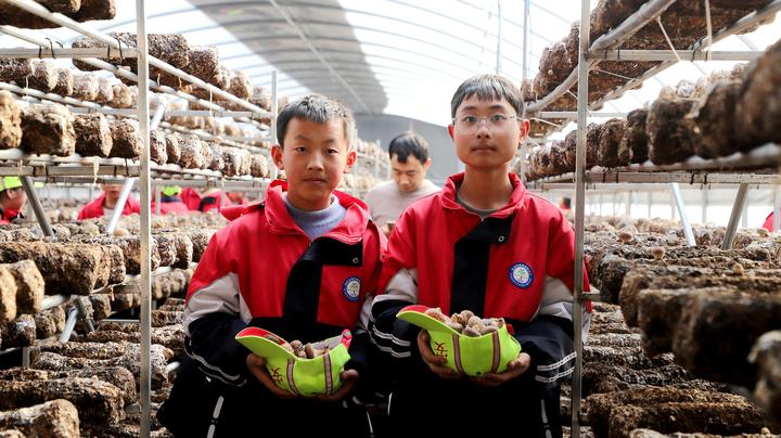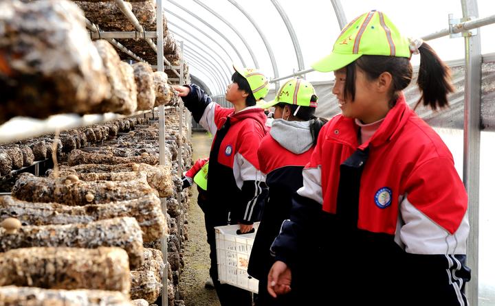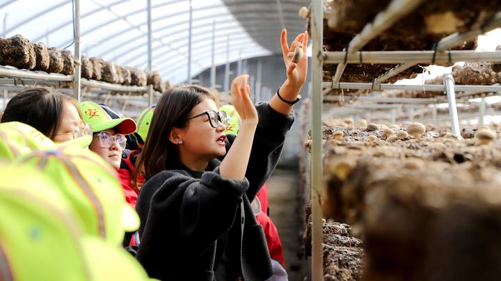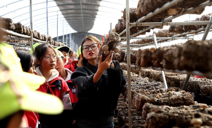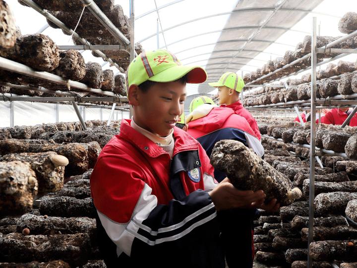 食用菌生产基地的研学氛围同样热烈。基地负责人采用“理论讲解+现场观摩+互动答疑+实操采摘”模式,用很接地气的语言解读食用菌生长周期、培育条件等知识。随后,同学们提着竹筐钻进菌棚,按照指导技巧小心翼翼地采摘香菇。不一会儿,大筐便被装满,有的同学还将香菇兜在帽子里,脸上满是收获的喜悦与劳动的自豪。
