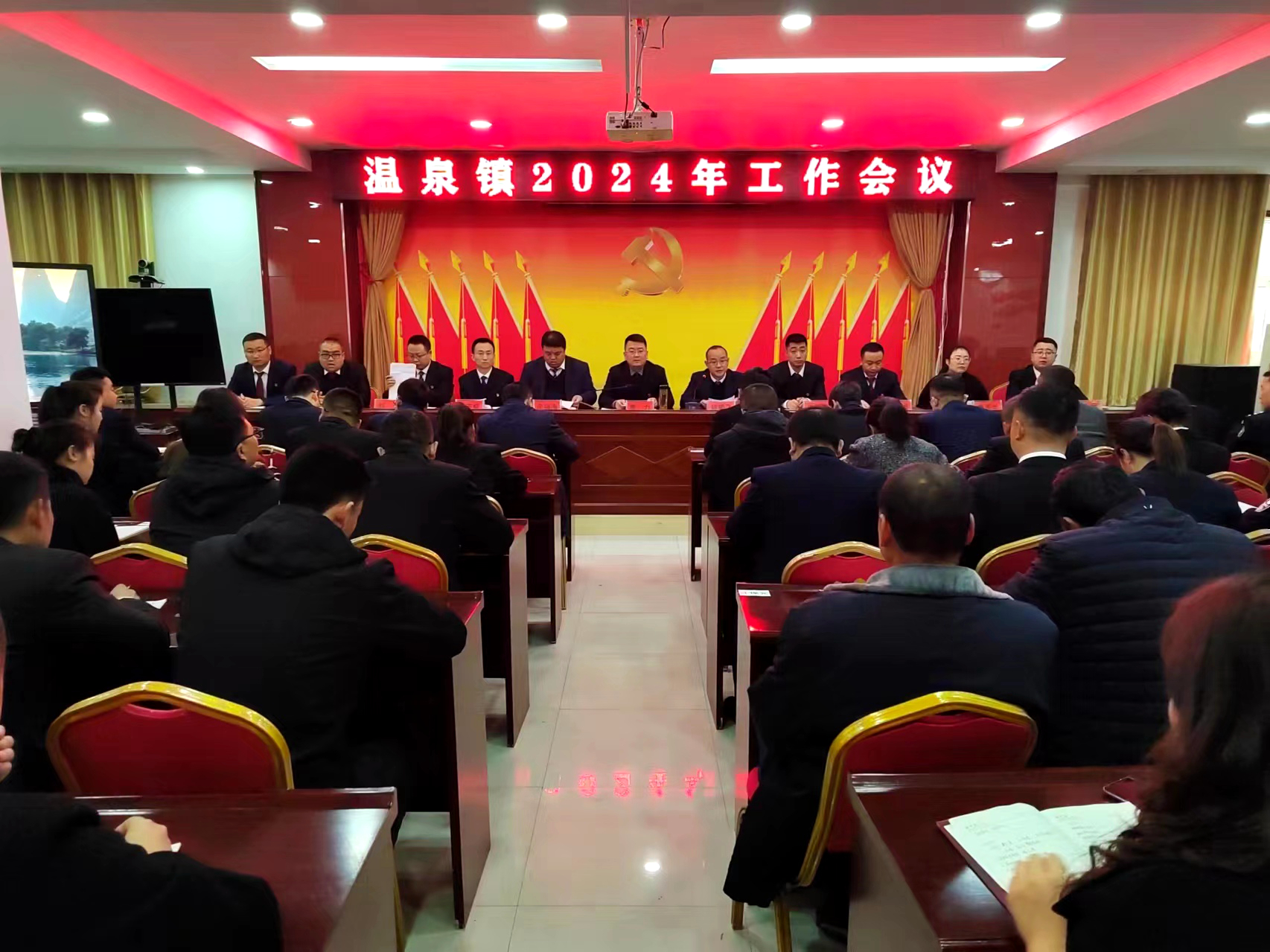 3月12日,温泉镇召开2024年工作会议,镇领导班子成员、全体干部、驻镇单位负责人、各村党支部书记、大学生文书、驻村帮扶工作队第一书记共计110余人参加会议。