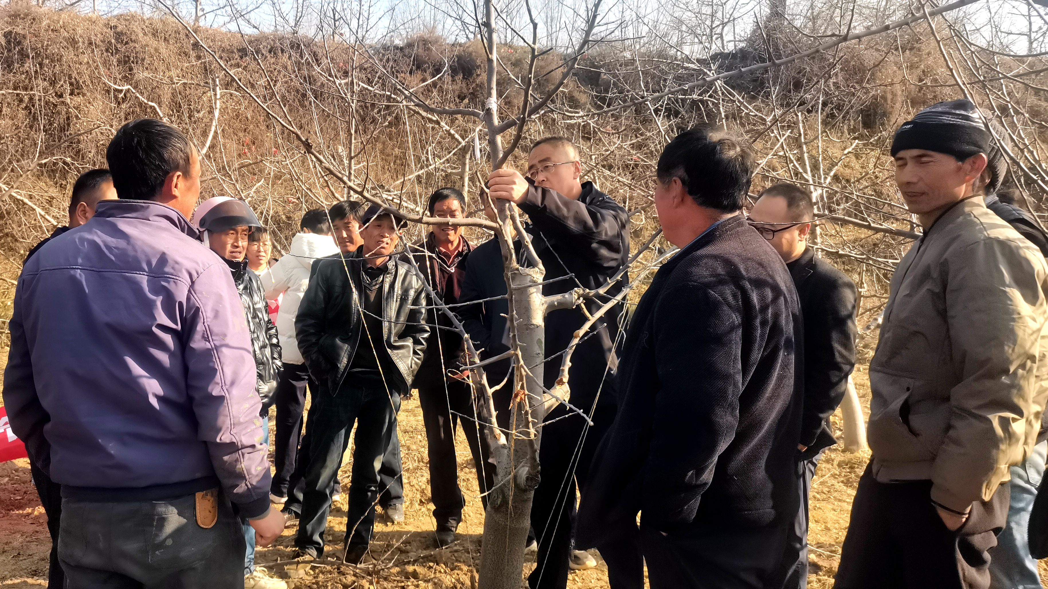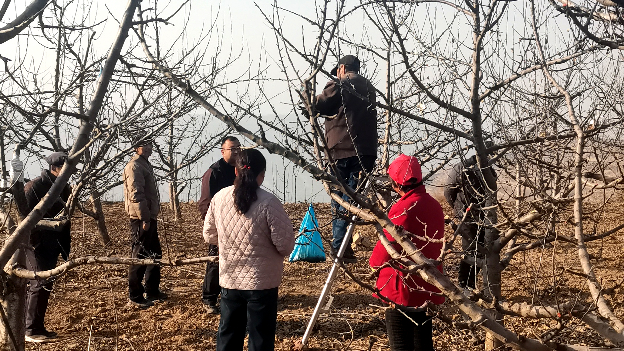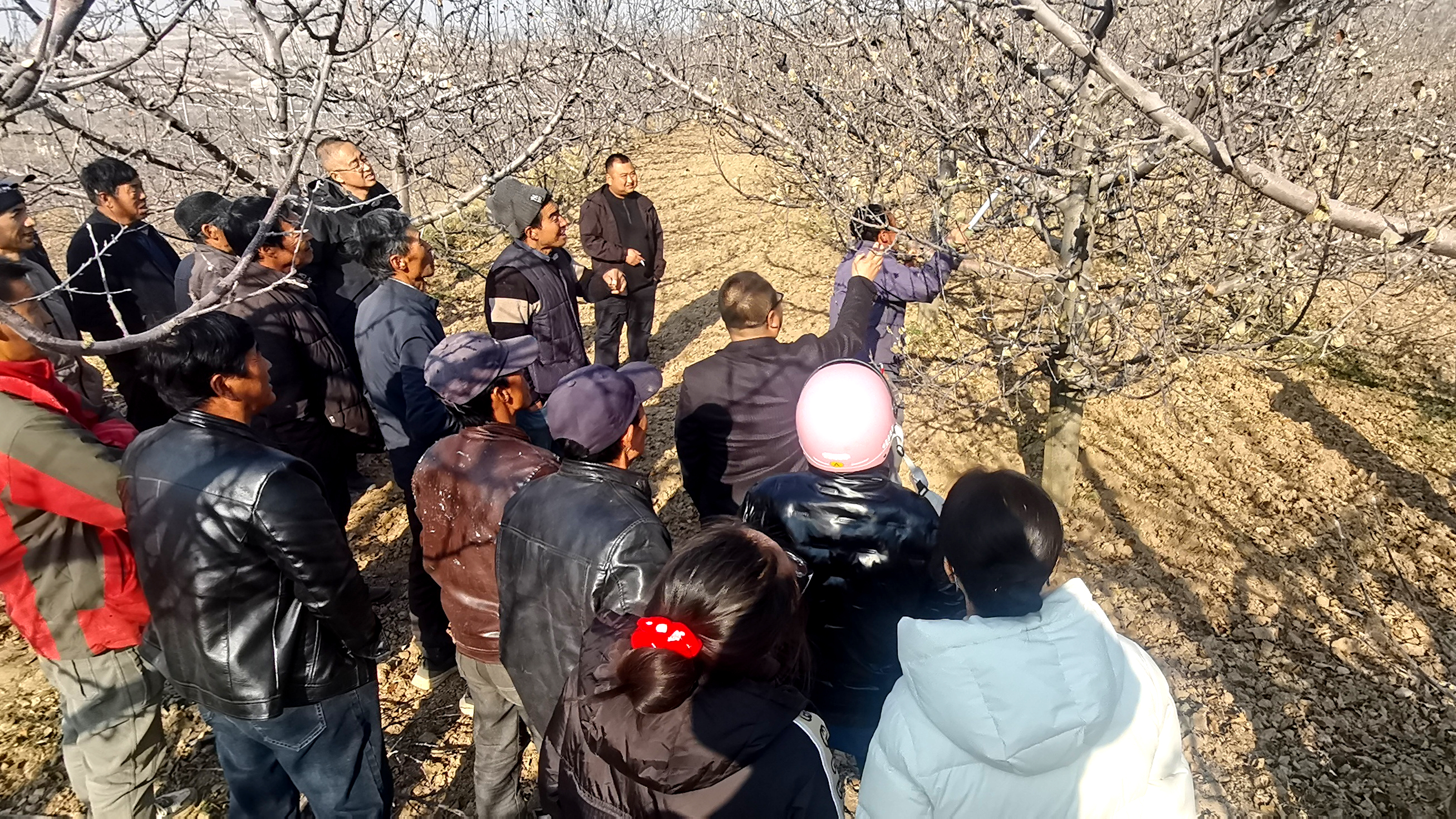 理论学习结束后,培训队伍迅速转战田间地头开展实地操作教学。技术人员选取不同树龄、树势的示范果树,手持修枝工具现场演示“疏枝、短截、回缩”等修剪手法,手把手教果农识别病弱枝、徒长枝、重叠枝,强调修剪工具需用75%酒精消毒、大伤口要及时涂抹保护剂的细节;同时示范树盘培土防寒(埋土高度20-30㎝)、土壤深翻(深度20-30㎝)等操作,现场纠正果农以往凭经验操作的不规范之处。