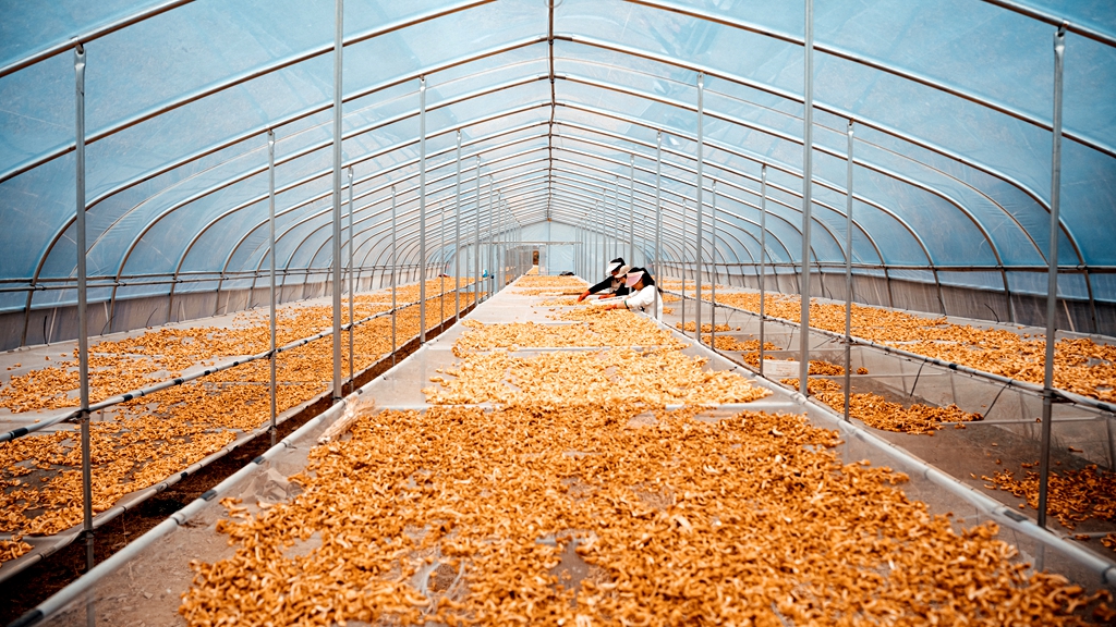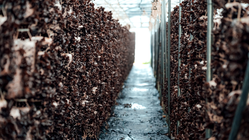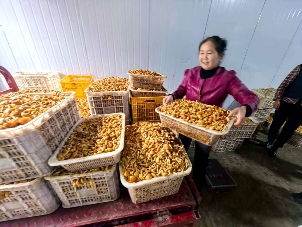 木耳种植大棚里,更是一派热闹景象。一朵朵黑木耳舒展着肥厚的菌瓣,黑亮有光泽,村民们小心翼翼地将成熟的木耳采摘下来,装满的竹筐在棚内堆成小山。“今年的木耳品相好、口感佳,通过线上商城+商超直供,根本不愁销!”村民捧着刚采摘的黑木耳,笑得合不拢嘴。
