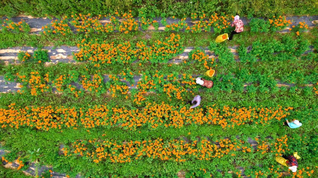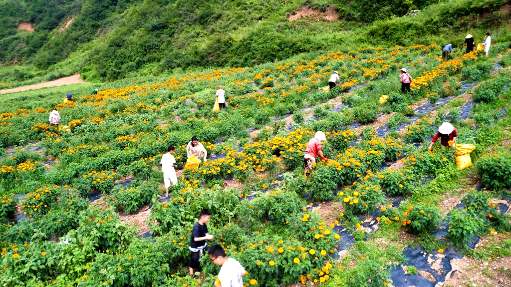 2000亩万寿菊种植基地宛如一片金色海洋。秋风拂过,朵朵万寿菊摇曳生姿,将田野装点得格外绚烂。村民们挎着竹篮穿梭花间,指尖翻飞间,饱满的花瓣便装满了篮子。“今年花苞又大又密,长势比去年还好,一斤能卖好几块,俺家种了5亩,今年能多挣不少!”采摘村民的话语里,满是丰收的踏实。