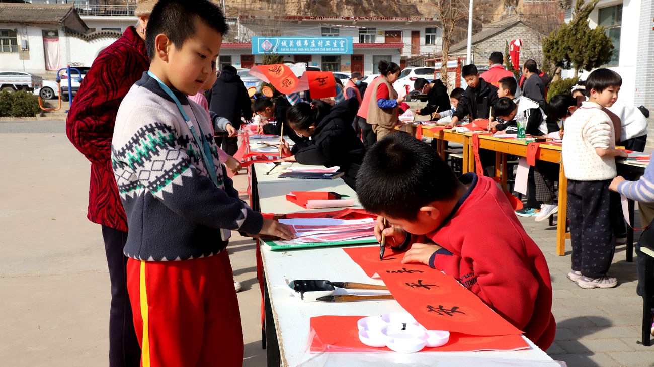 新武山讯(记者 杨彦春 王继明)马蹄声声新春到,翰墨飘香福气来。在人们忙着赶大集、办年货之际,近日,由武山县文联指导、领宽艺术培训中心协办的“新春送福联·文艺润乡村”迎新春送文艺惠民活动来到城关镇韦庄村,为群众送上一份别样的新年礼物,30名6至12岁的书法小能手与5位县书协名师携手挥毫,将200余对饱含马年祝福的春联与福字送到村民手中,让翰墨书香为乡村新春增添了醇厚的文化韵味。