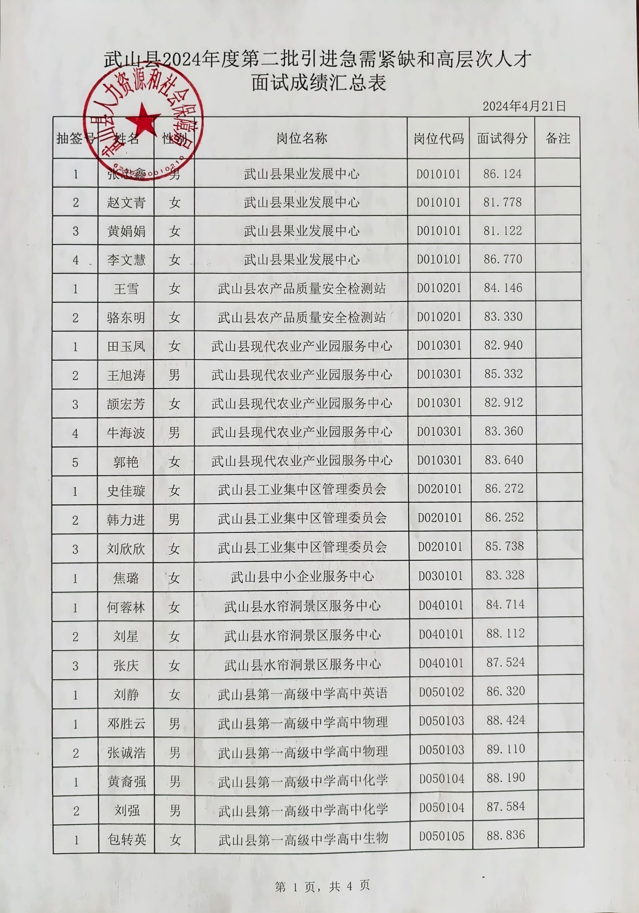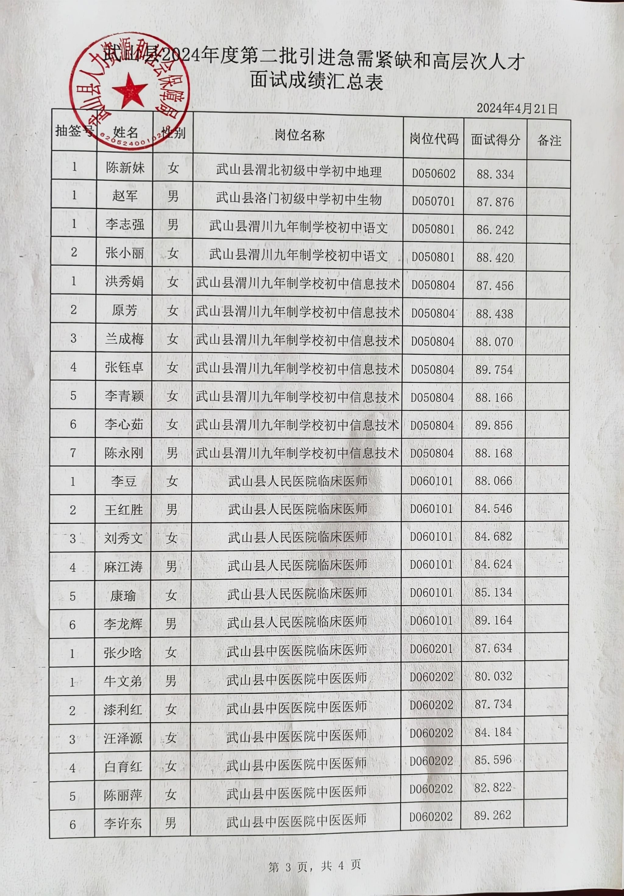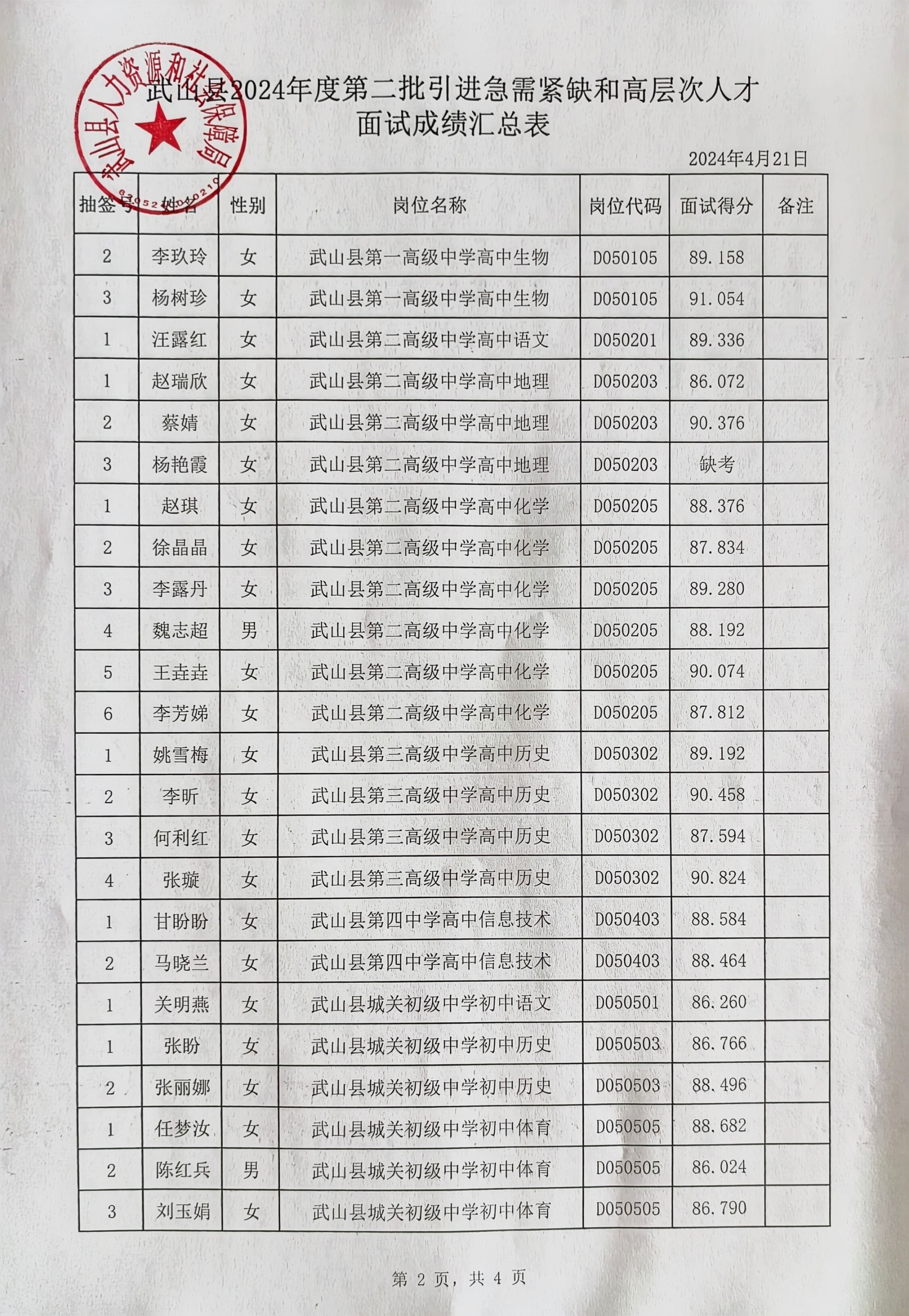 根据《天水市急需紧缺和高层次人才引进实施办法》及《天水市2024年度第二批引进急需紧缺和高层次人才公告》有关规定,武山县2024年度第二批人才引进于2024年4月21日进行了面试,现将面试成绩予以公示,公示期为5个工作日。