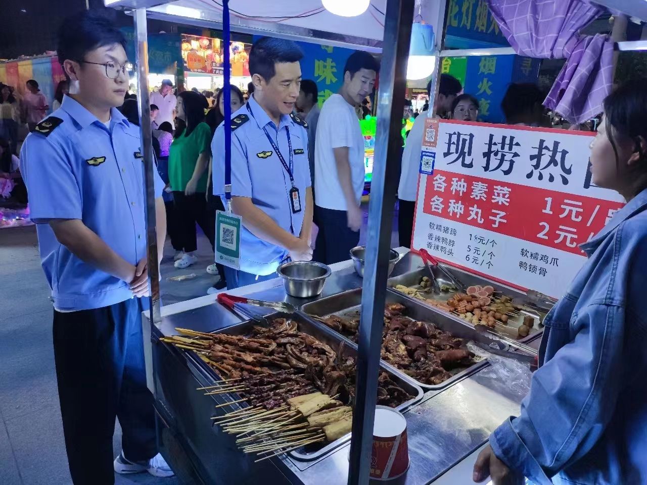 检查中,执法人员针对夜市中常见的食材防护不到位、信息公示不完整、食品贮存及口罩发帽佩戴不规范等违法违规行为进行监督检查并责令现场整改。同时,执法人员还就食品安全法律法规、制止餐饮浪费等相关内容对从业人员进行了宣传教育,督促经营户要认真履行食品安全主体责任,合法诚信经营,增强安全意识,并提醒经营者做好垃圾入篓,切实维护好夜间市场卫生环境。