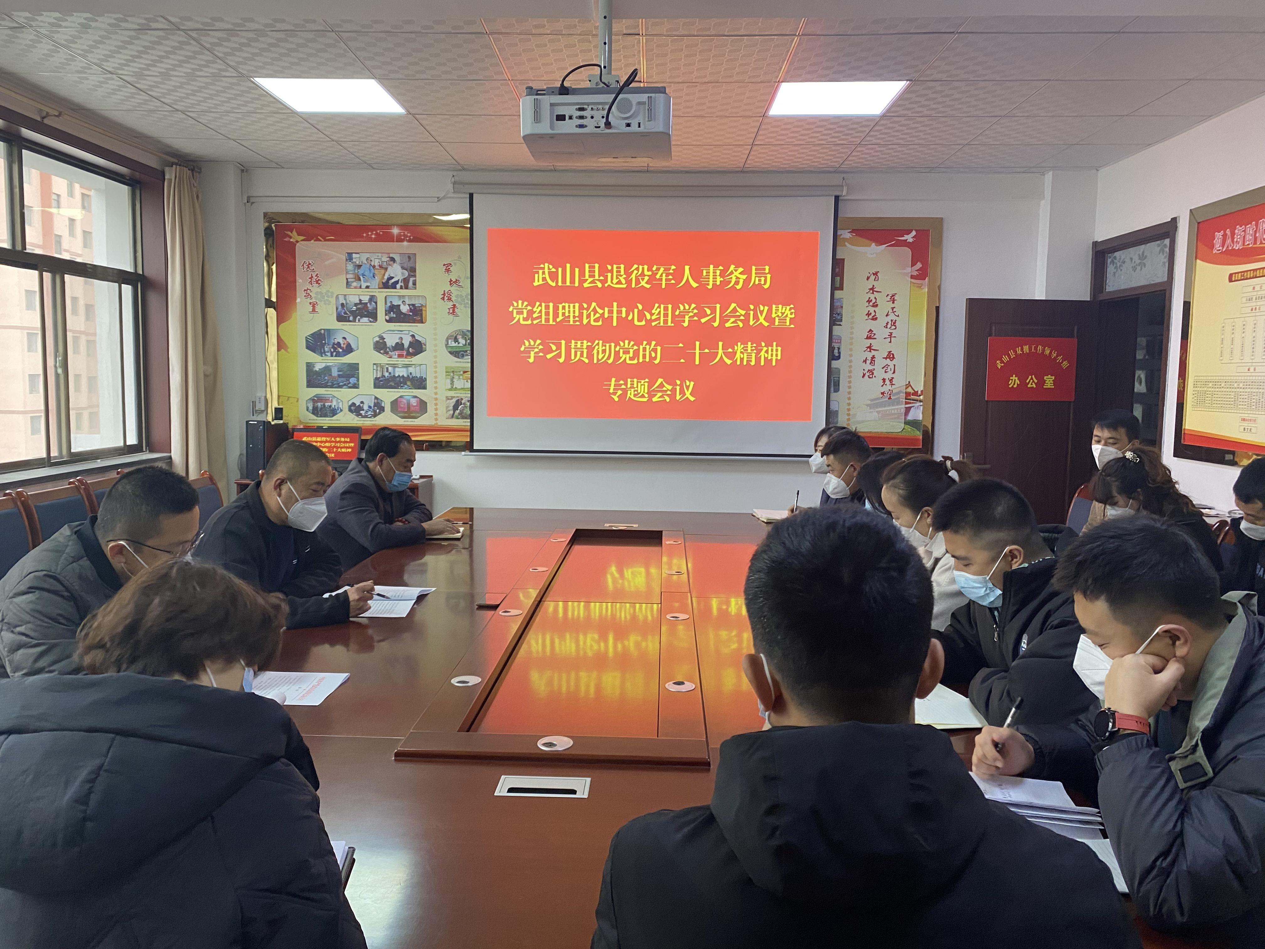11月21日,武山县退役军人事务局召开党组理论学习中心组学习(扩大)会议暨学习贯彻党的二十大精神专题会议。会上,主要负责同志领学了《中国共产党章程》、《习近平谈治国理政》第四卷部分章节、《党的二十大报告学习辅导百问》部分篇目,传达了近期县上重要会议精神,安排部署了近期重点工作。
