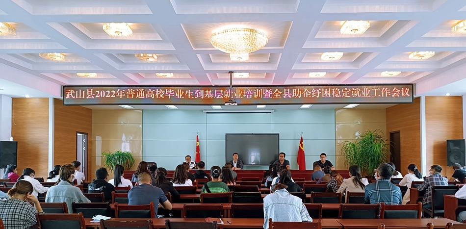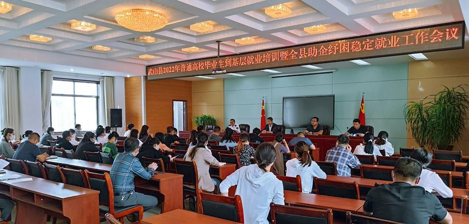 为贯彻党中央、国务院和省委省政府稳住经济大盘以及稳就业保就业工作的一系列决策部署,全面落实就业优先战略,引导高校毕业生到基层就业,努力为企业纾困解难。8月26日,武山县人社局组织召开了“武山县2022年普通高校毕业生到基层就业培训暨全县助企纾困稳定就业工作会议”,县公共就业和人才服务中心、社会保险事业服务中心、劳动保障监察中队和15个基层单位负责人、业务员、到基层就业普通高校毕业生近100人参加了会议。