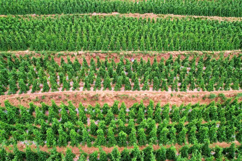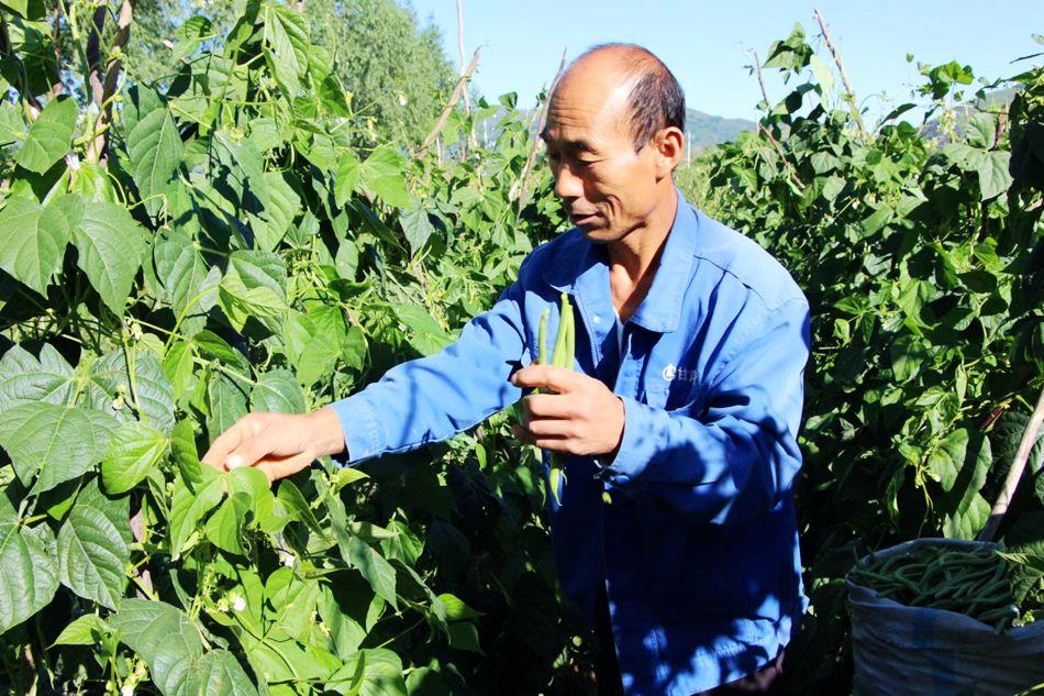 站在山上望过去,一墚一塆都被绿色覆盖着,两米高的豆角藤蔓整齐的排列在地里,枝条随风摇曳,嫩绿笔直的豆角挂满枝头,紫色、白色的小花竞相绽放,这片希望的土地承载着村民致富的梦想。