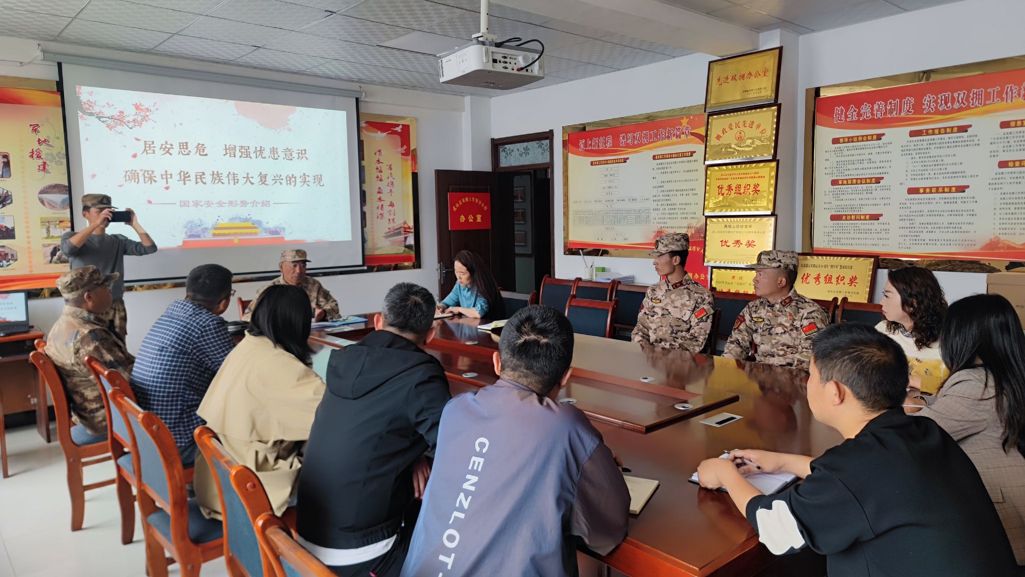 坚持党建引领,贯彻国防建设。敖卫大校在县退役军人事务局以“居安思危 增强忧患意识 确保中华民族伟大复兴的实现”为主题给全体干部职工进行了党课辅导。从国防安全、社会稳定情况、实现中华民族伟大复兴路上的台湾问题及外来安全问题等四个方面,深刻阐述了做好新时代国防建设的重要意义。全体干部职工主动思考,积极互动,并一致表示,敖卫大校的授课让人受益匪浅,今后将坚持以高标准、高质量做好退役军人事务各项工作。