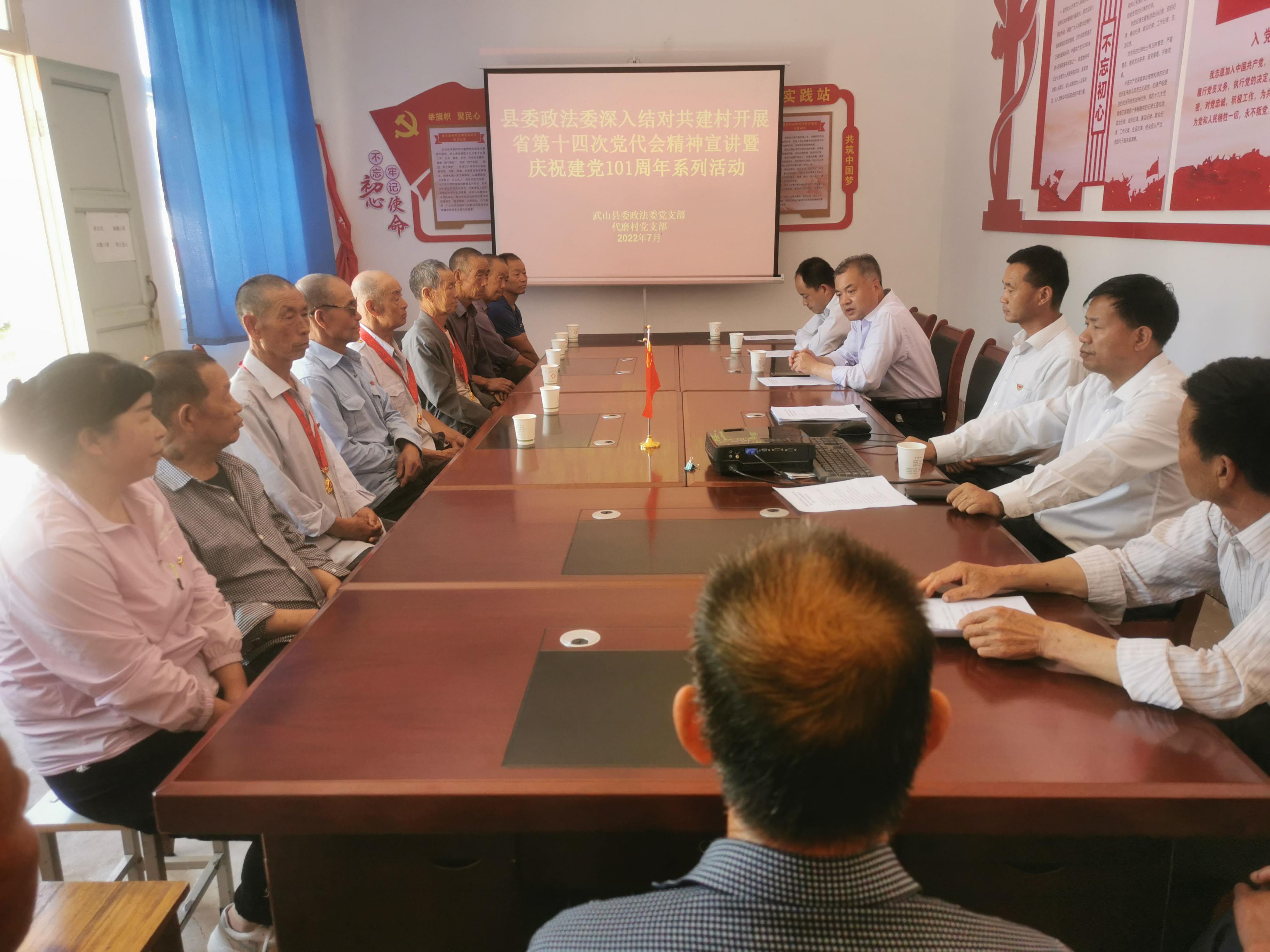 7月1日建党节当天,县委政法委党支部深入结对共建村滩歌镇代磨村开展省第十四次党代会精神宣讲暨庆祝建党101周年系列活动。