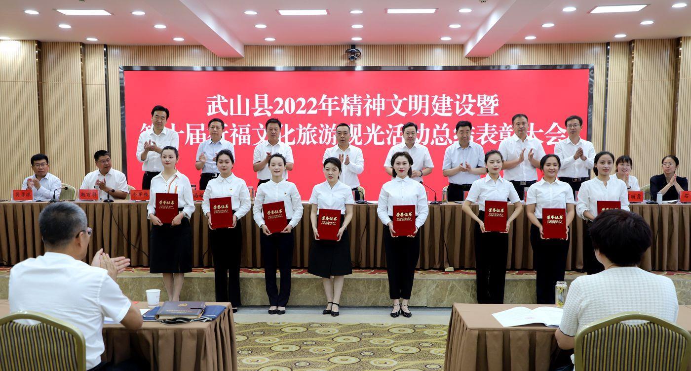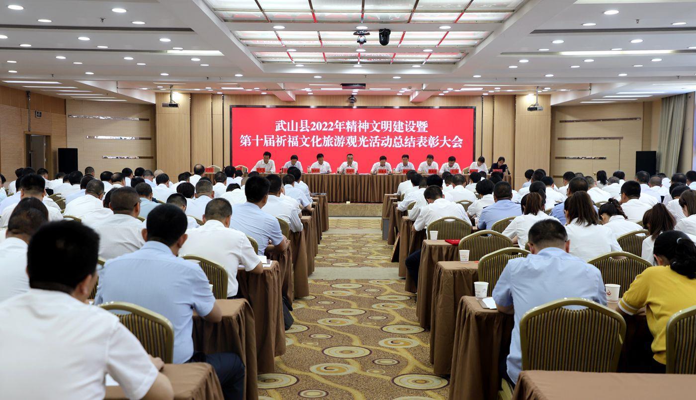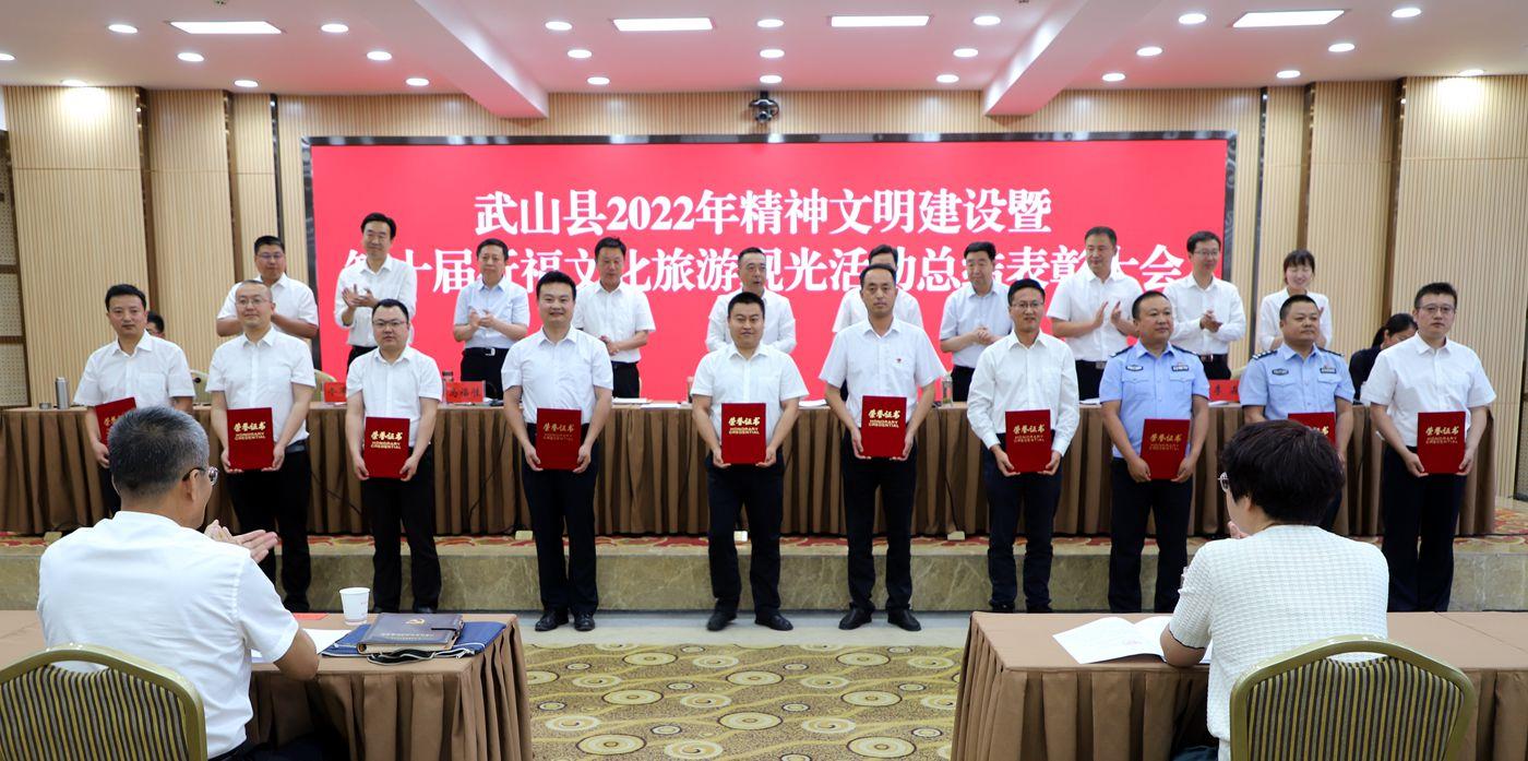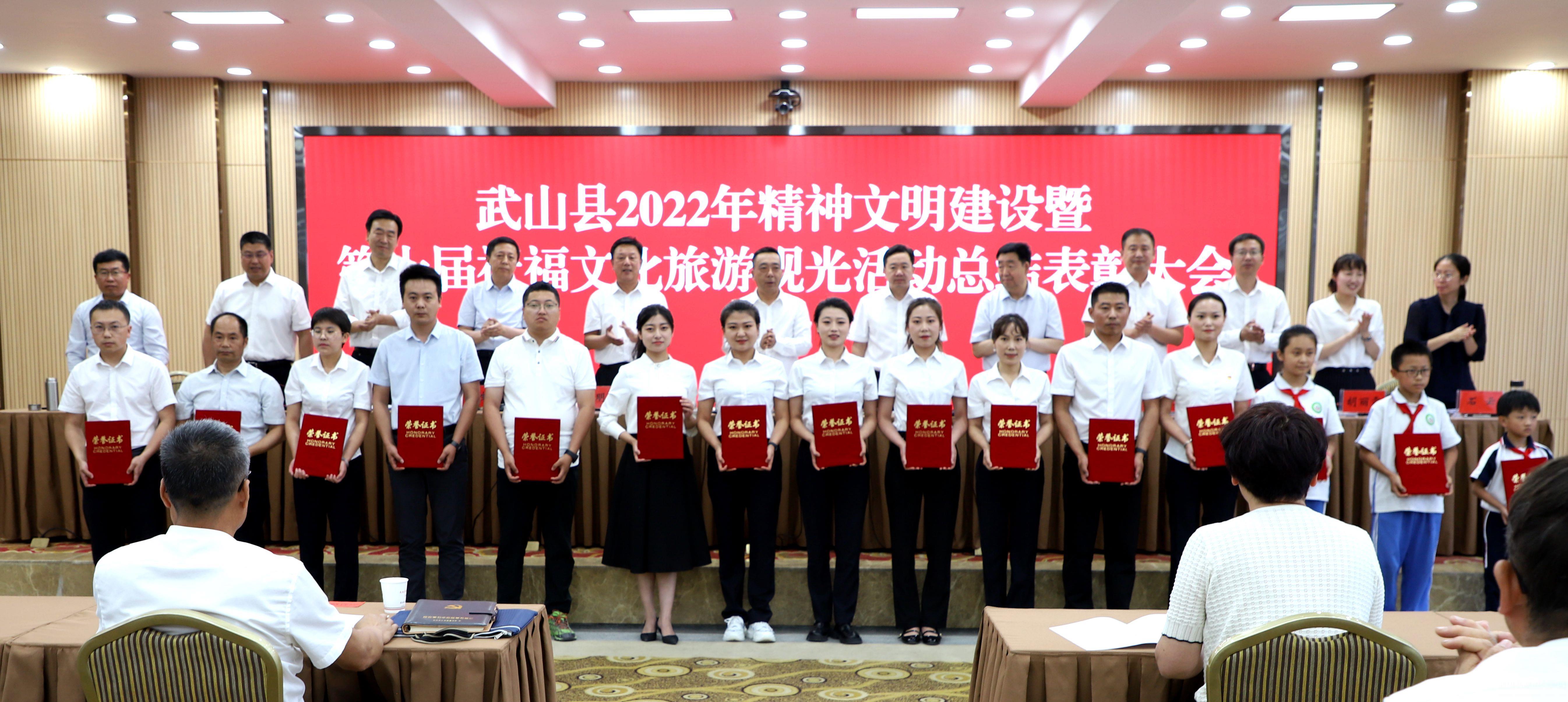 武山县融媒体中心7月1日讯(记者蒲爱民 管秋勇)6月30日,武山县召开2022年精神文明建设暨第十届祈福文化旅游观光活动总结表彰大会,对获得祈福文化旅游观光活动筹办“先进单位”荣誉称号的县委办公室等18个单位,获得“先进个人”荣誉称号的杨利民等12名同志,获得“优秀讲解员”荣誉称号的令雨菲等10名同志,获得“优秀志愿者”荣誉称号的徐强强等20名同志进行了表彰。