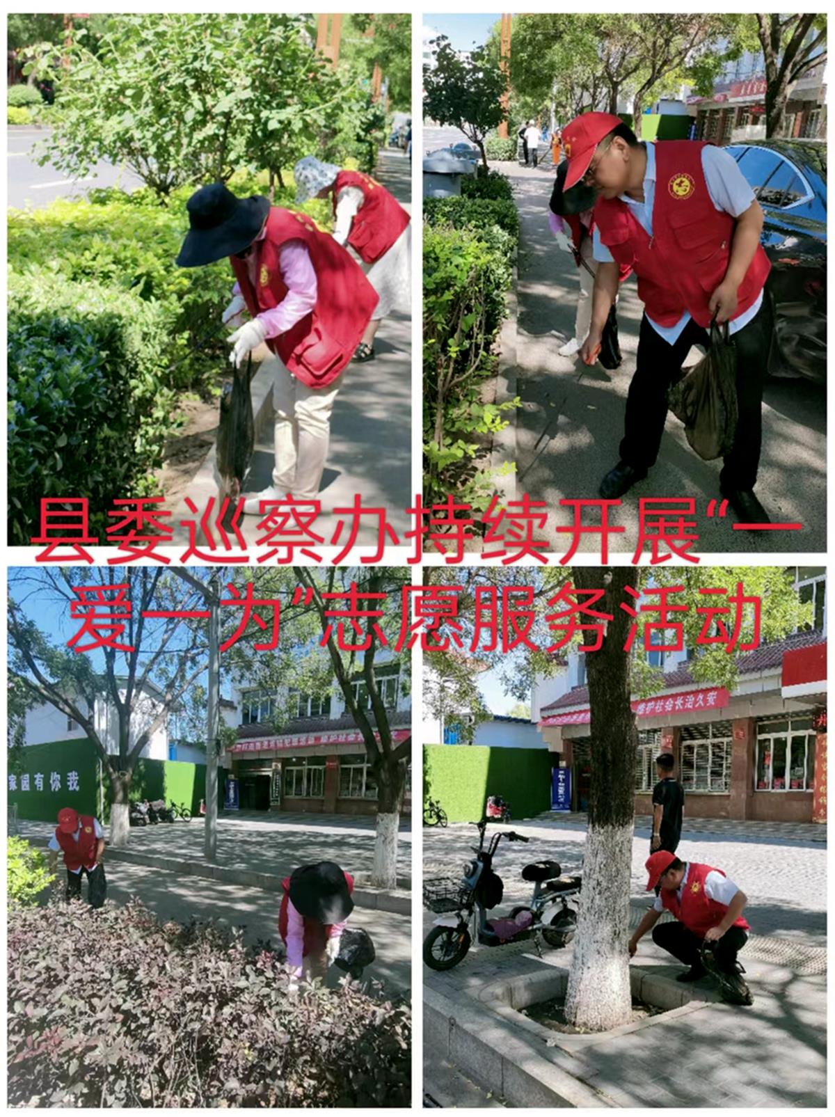 “志愿红”来到居民小区、农贸市场、公路沿线、河道,积极参与绿化带、小区环境卫生、乱贴乱画、河道保洁、垃圾集中清理活动。同时,积极动员区域内商家、住户、群众参与到“一爱一为”志愿服务行动中来,切实激发群众“主人翁”意识,鼓励引导群众养成爱护环境的良好习惯。