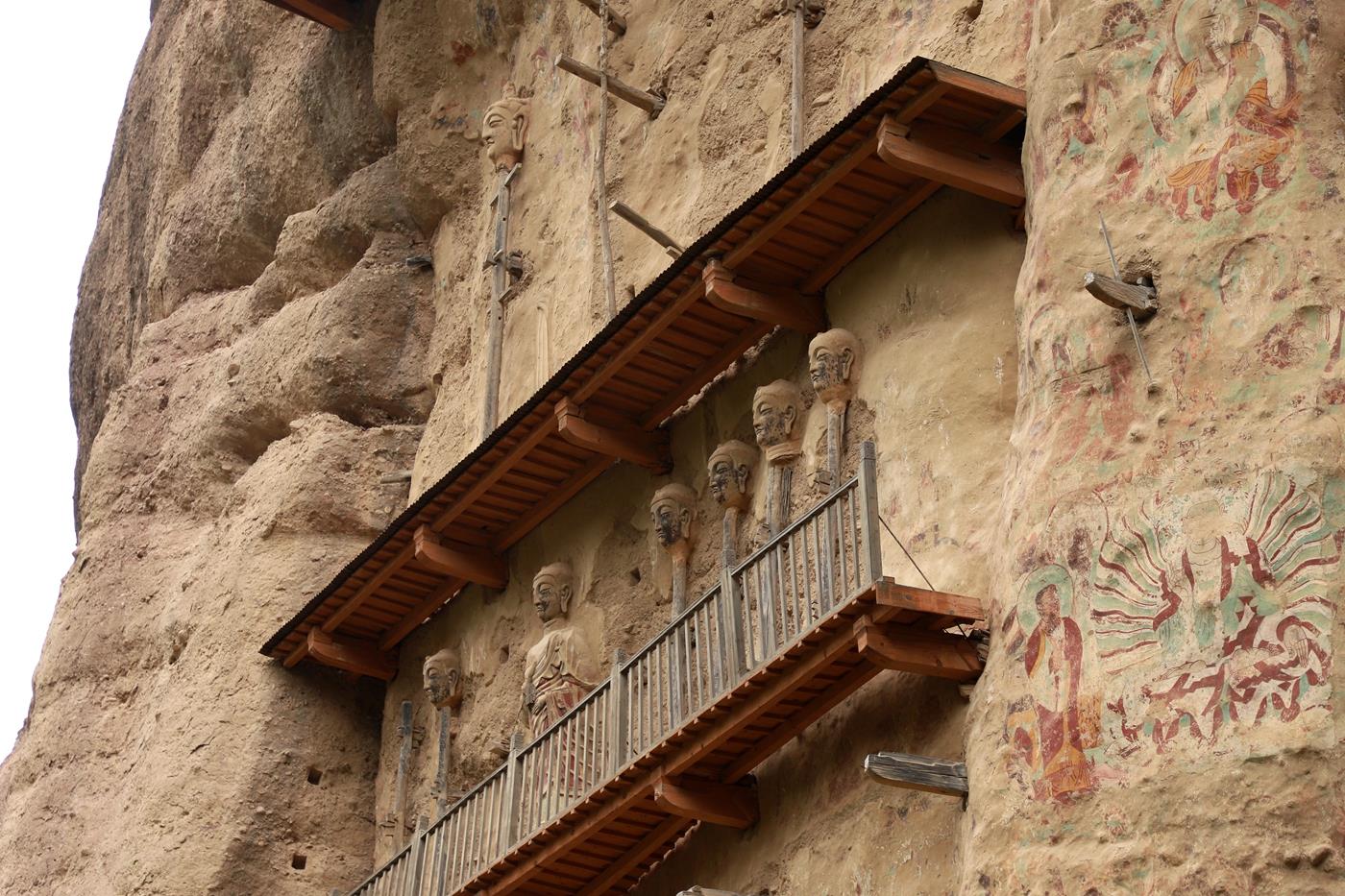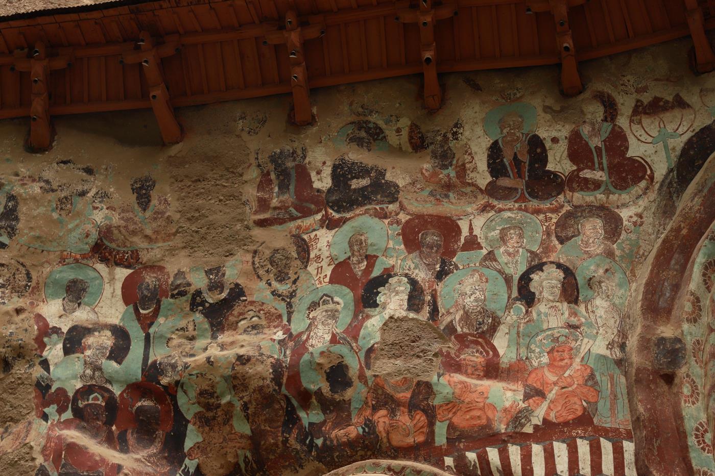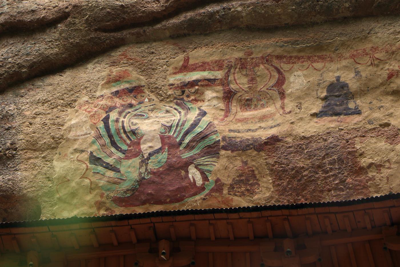 摩崖浮雕造像以南,壁画占整个崖面的三分之二,为宋、元和明的作品,在大佛周围既做陪衬又突出主题,菩萨头上彩绘弟子、罗汉、菩萨及力士。崖壁上方有北周时期的木骨泥塑一佛二菩萨,现仅存两菩萨的头部。下方是十方佛,现有一尊完整,五尊剩头部。这种塑像是从崖面先打孔插桩,再敷泥成像,木桩呈现黑色,是因为在制作时经过刻意焚烧碳化,来防止虫蛀朽坏,延长保存期。泥塑下有两座元代舍利塔,塔柱彩绘色泽艳丽,有浓郁的藏族绘画风格,说明在元代时甘肃一带盛行藏传佛教。十方佛下方是著名的明代“经变图”,是整个崖面中保存的最为完整的一组壁画,人物丰富,造型迥异,绘画精美,是珍贵的文物。